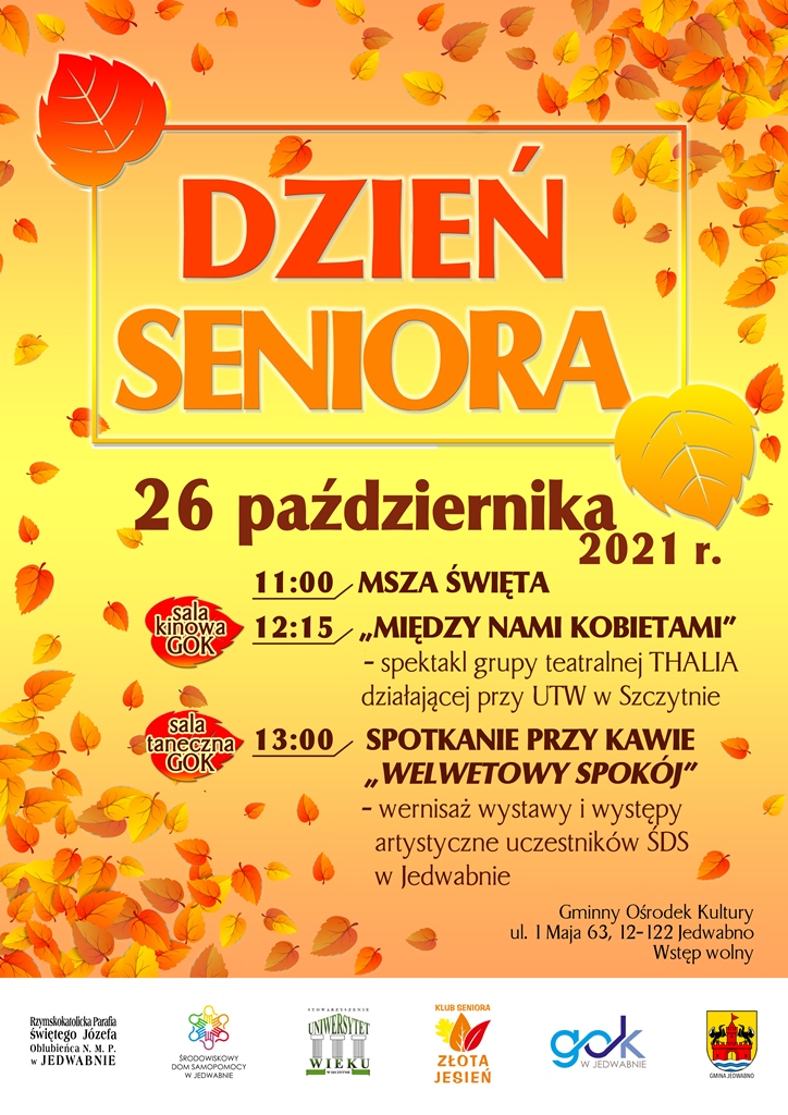 Przed nami Dzień Seniora, który w Jedwabnie odbędzie się 26 października 2021 r. Uroczystość rozpocznie Msza Święta w kościele Św. Józefa i Matki Boskiej Częstochowskiej w Jedwabnie.  Na część artystyczną wydarzenia zapraszamy do Gminnego Ośrodka Kultury w Jedwabnie gdzie wystąpi grupa teatralna THALIA działająca przy Uniwersytecie Trzeciego Wieku w Szczytnie ze spektaklem „Między nami kobietami”. Spotkanie przy kawie umili wernisaż wystawy pn. „Welwetowy spokój” i występy artystyczne uczestników Środowiskowego Domu Samopomocy w Jedwabnie.  Szczegóły na plakacie! Zapraszamy!