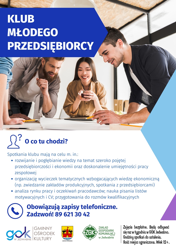 W Gminnym Ośrodku Kultury w Jedwabnie uruchamiamy Klub Młodego Przedsiębiorcy . Spotkania klubu mają na celu m.in. rozwijanie i pogłębianie wiedzy na temat szeroko pojętej przedsiębiorczości i ekonomii oraz doskonalenie umiejętności pracy zespołowej, a także organizację wycieczek tematycznych wzbogacających wiedzę ekonomiczną (np. zwiedzanie zakładów produkcyjnych, spotkania z przedsiębiorcami). Zajęcia będą odbywały się 1 raz w tygodniu. Wiek 12+.  Zapisy przyjmujemy pod nr telefonu 89 621 30 42. Zapraszamy!