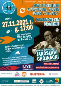 Zapraszamy na galę podsumowującą projekt „Nowe technologie w bezpiecznej służbie jesieni życia 2021”, która odbędzie się w sobotę 27 listopada o godz. 17:00 w sali widowiskowej Miejskiego Domu Kultury w Szczytnie. Spotkanie uświetni swoim występem JAROSŁAW CHOJNACKI. Wydarzenie będzie także transmitowane na żywo na kanale YOUTUBE (https://www.youtube.com/channel/UCpAMjrIuaAH75Hnx2MpYkyA) i udostępnione na profilu Facebook www.facebook.com/nszmazury oraz stronie projektu www.senior.wmcn.pl