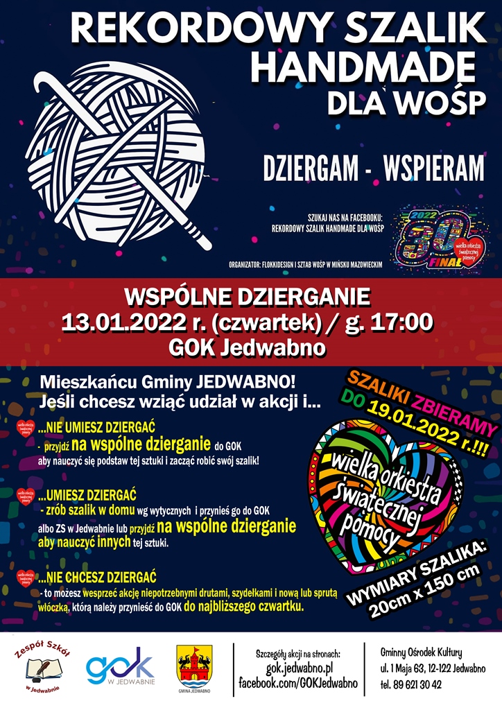 UWAGA! Gotowe szaliki można dostarczać do Gminnego Ośrodka Kultury w Jedwabnie lub Zespołu Szkół Podstawowych w Jedwabnie – w godzinach pracy instytucji do dnia 19.01.2022 r.