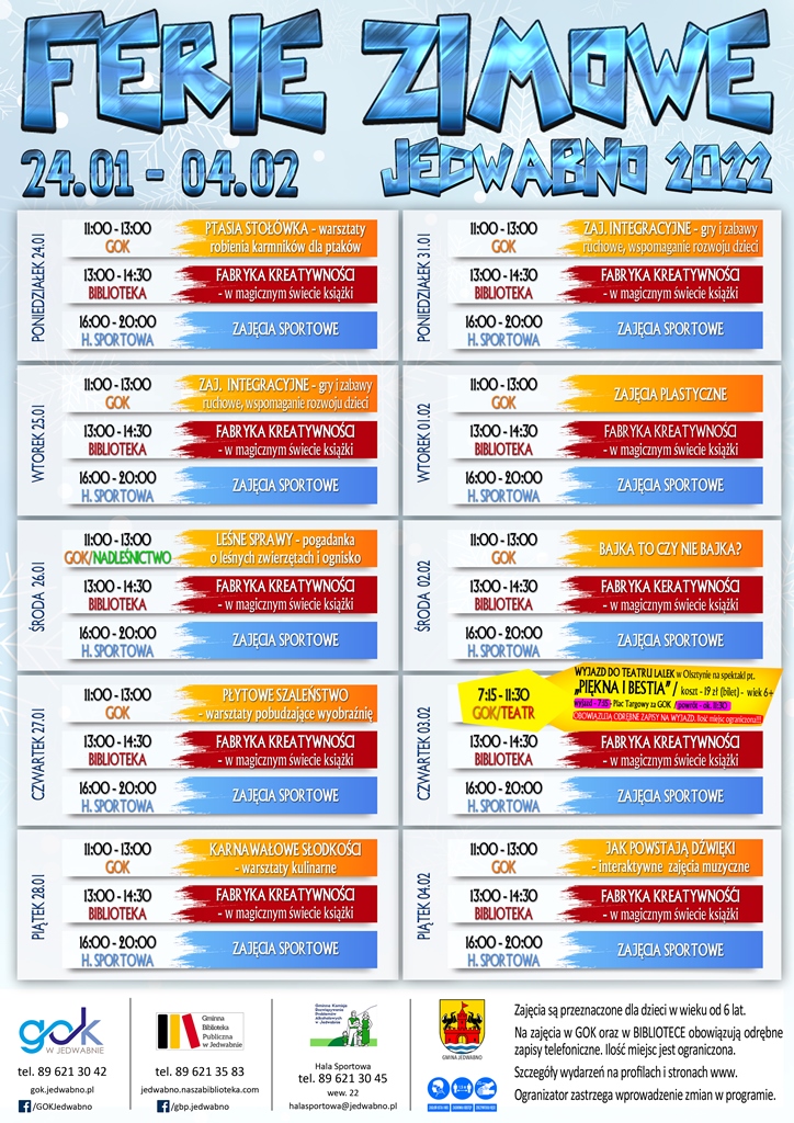 Zapraszamy dzieci od 6 r. ż. na zajęcia z okazji FERII ZIMOWYCH 2022 w Gminie Jedwabno. Na zajęcia w Gok oraz w Bibliotece obowiązują odrębne zapisy telefoniczne. Ilość miejsc ograniczona!