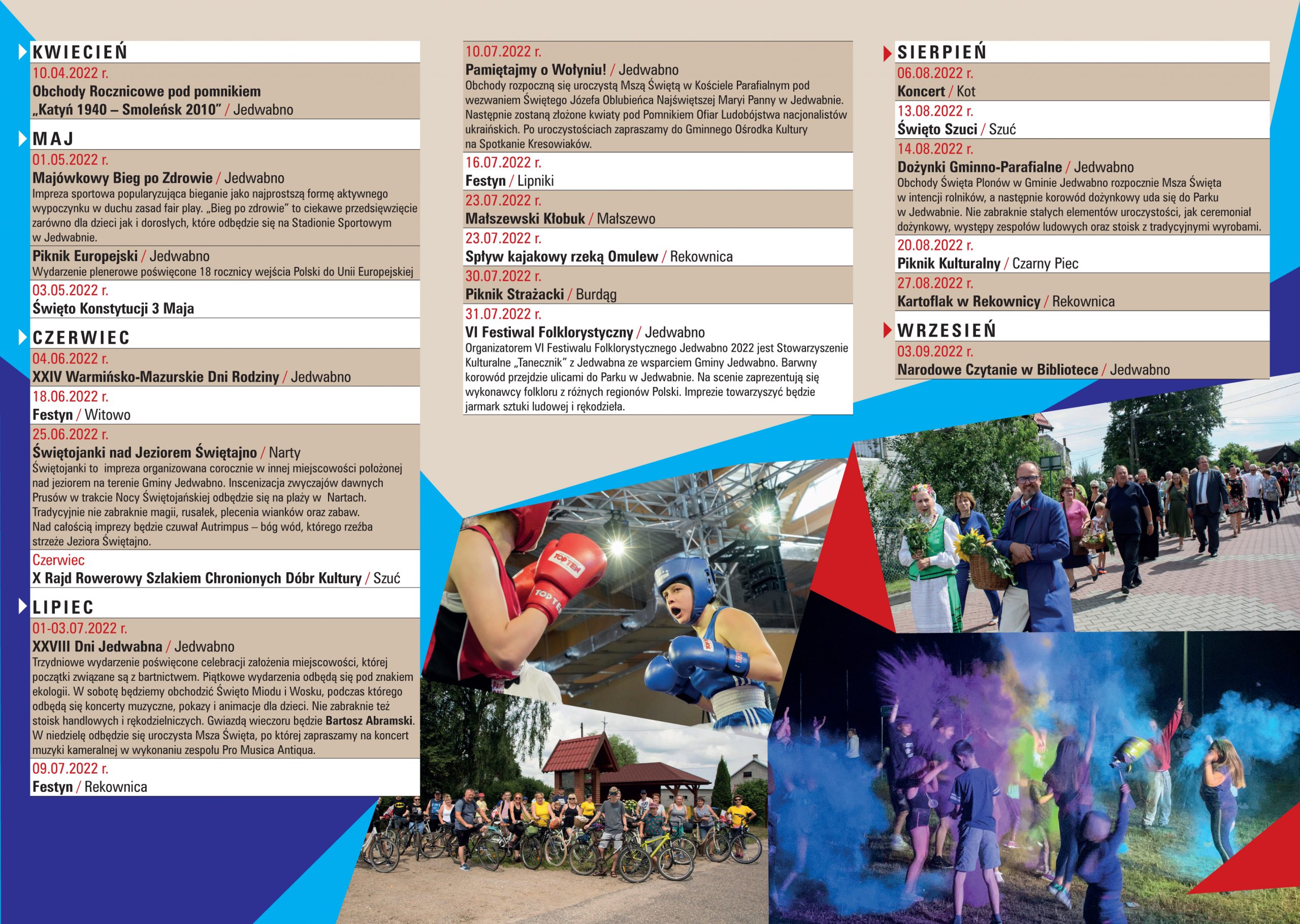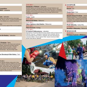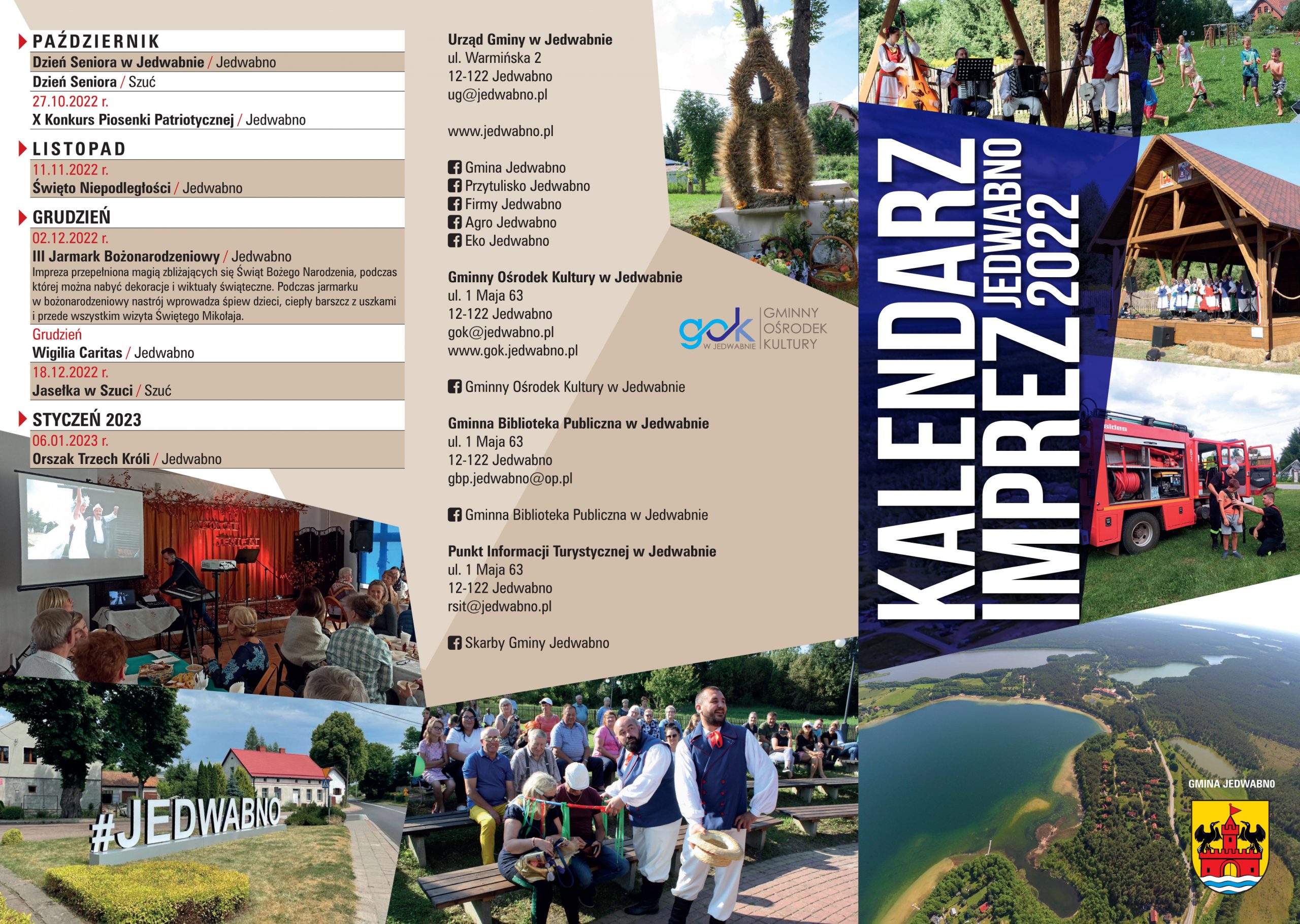 Z przyjemnością prezentujemy Państwu świeżutki Kalendarz Imprez Gminy Jedwabno na 2022 rok. Ulotka zawiera planowane wydarzenia kulturalne i sportowe w ciągu roku 2022 przez jednostki samorządowe, sołectwa, instytucje oraz organizacje pozarządowe.