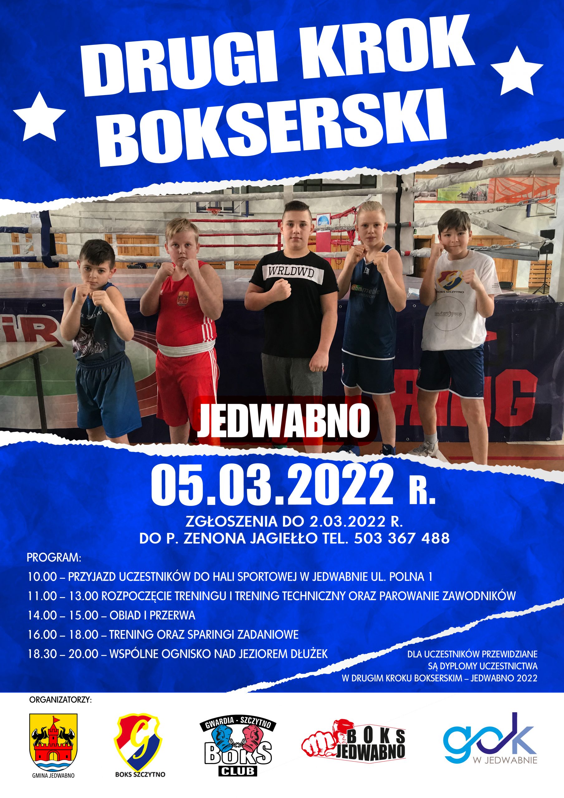 W imieniu Organizatora zapraszamy na DRUGI KROK BOKSERSKI, który odbędzie się 05.03.2022 r. , na Hali Sportowej w Jedwabnie. Zgłoszenia do 02.03.2022 r. ,do p. Zenona Jagiełło pod nr tel. 503 367 488. Szczegóły na plakacie!