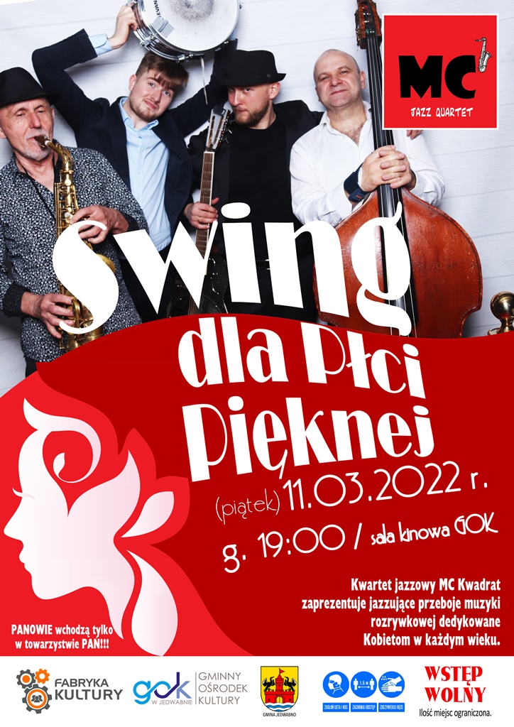 Zapraszamy w piątek 11.03.2022 r. o godz. 19:00 do GOK w Jedwabnie na koncert z okazji Dnia Kobiet, podczas którego Kwartet jazzowy MC Kwadrat zaprezentuje jazzujące przeboje muzyki rozrywkowej dedykowane kobietom w każdym wieku. Panowie wchodzą tylko w towarzystwie Pań, które zaprosili na wspólny wieczór przy dobrej muzyce.