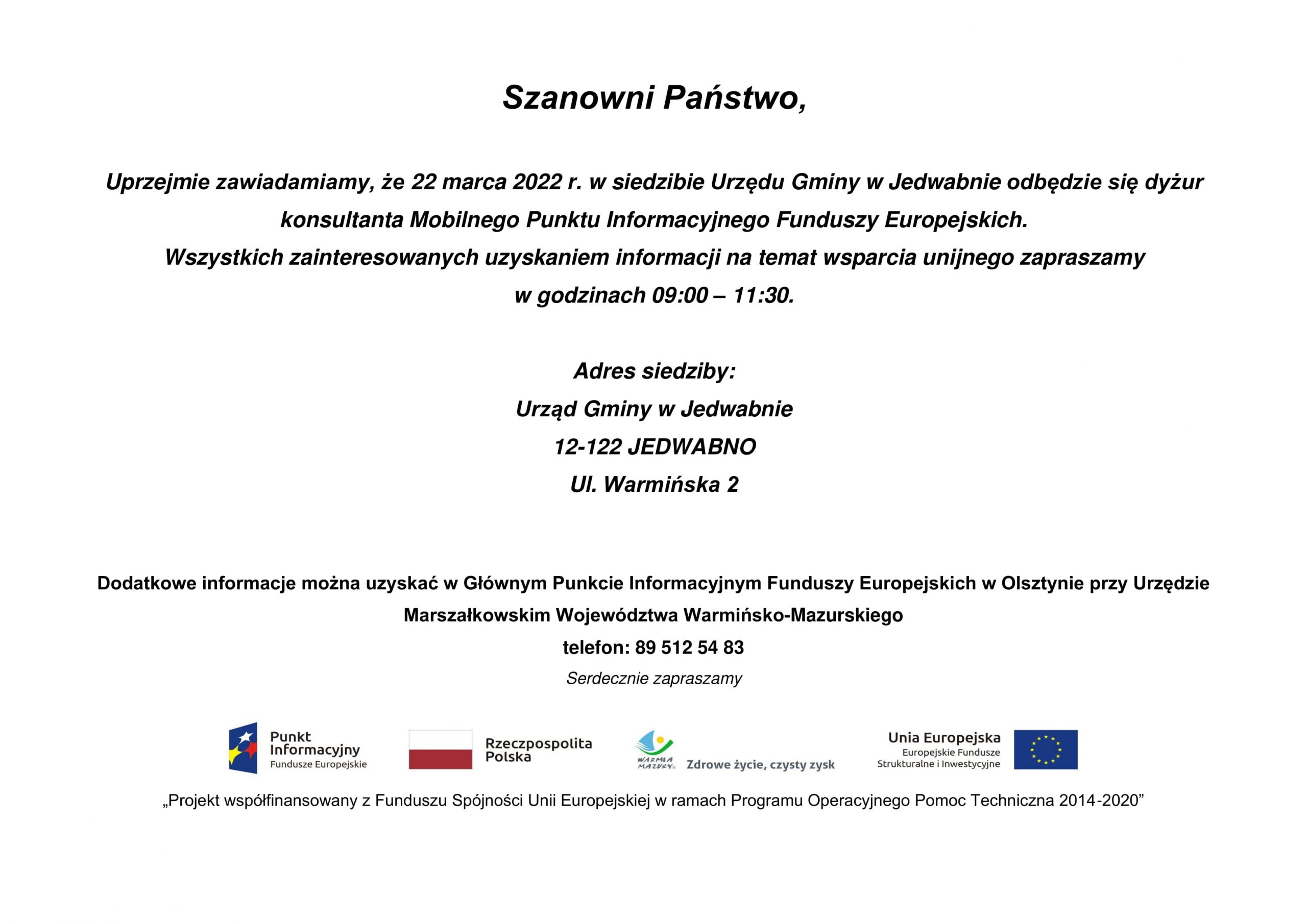 3. Dyżur konsultanta Mobilnego Punktu Informacyjnego Funduszy Europejskich 22.03.2022 r.