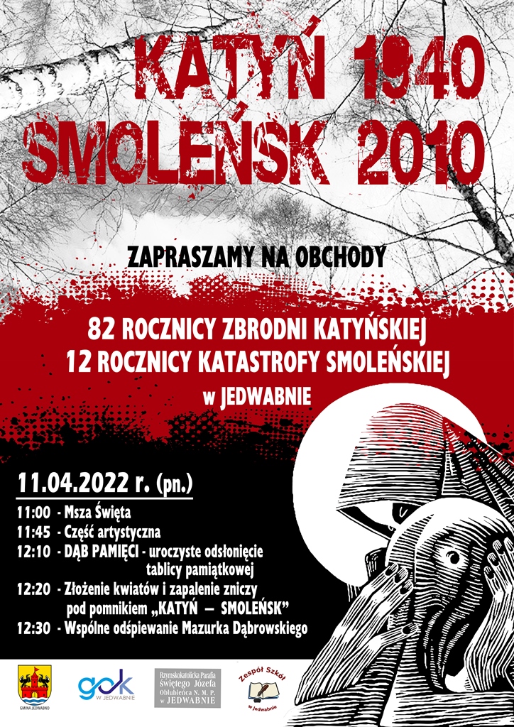 Zapraszamy na Obchody  82 Rocznicy Zbrodni Katyńskiej oraz 12 Rocznicy Katastrofy Smoleńskiej, które w Jedwabnie odbędą się 11.04.2022 r. (poniedziałek). Celebrację Obchodów rozpoczniemy  Mszą Świętą w kościele Świętego Józefa i Matki Boskiej Częstochowskiej w Jedwabnie o godz. 11:00. Szczegóły na plakacie!