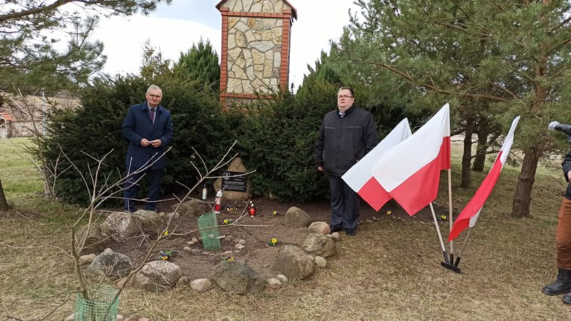 - Wójt Gminy Jedwabno oraz Pan Szczepan Worobiej przy Dębie Pamięci
