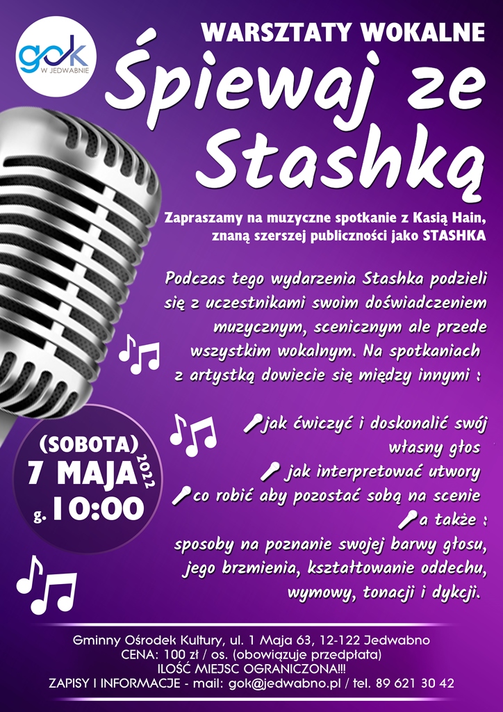Zapraszamy na warsztaty wokalne Śpiewaj ze Stashką, które odbędą się 7 maja 2022 r. , o godz. 10:00 w Gminnym Ośrodku Kultury w Jedwabnie. Koszt warsztatów to 100 zł ( obowiązuje przedpłata), ilość miejsc ograniczona. Zapisy i informacje mail: [email protected] / tel. 89 621 30 42. Więcej informacji na plakacie!