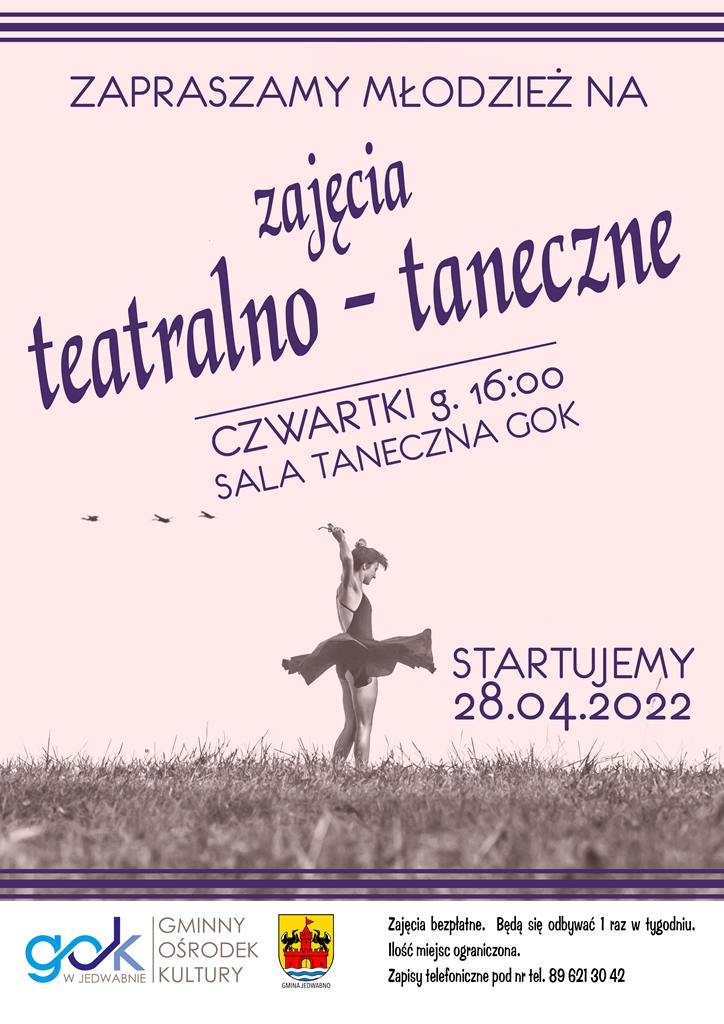 Zapraszamy młodzież na zajęcia teatralno – taneczne, które będą odbywały się w czwartki o godz. 16:00 w sali tanecznej Gminnego Ośrodka Kultury. Zajęcia są bezpłatne. Start od 28.04.2022 r. Szczegóły na plakacie.