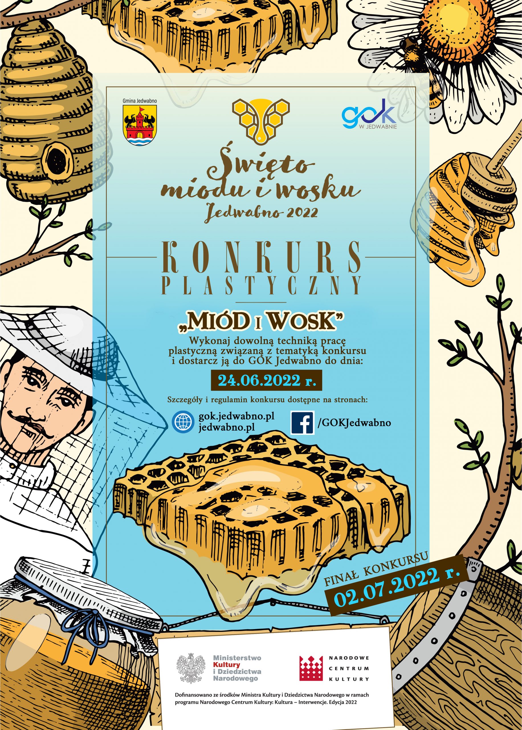 Zapraszamy do wzięcia udziału w konkursie plastycznym pn. „MIÓD i WOSK”, którego organizatorem jest Gminny Ośrodek Kultury w Jedwabnie. Aby wziąć udział w konkursie należy wykonać dowolną techniką pracę plastyczną nawiązującą tematyką do miodu i/lub wosku. W konkursie mogą wziąć udział dzieci i młodzież oraz dorośli mieszkańcy Gminy Jedwabno. Termin dostarczenia prac konkursowych upływa w dniu 24.06.2022 r., o godzinie 15:00