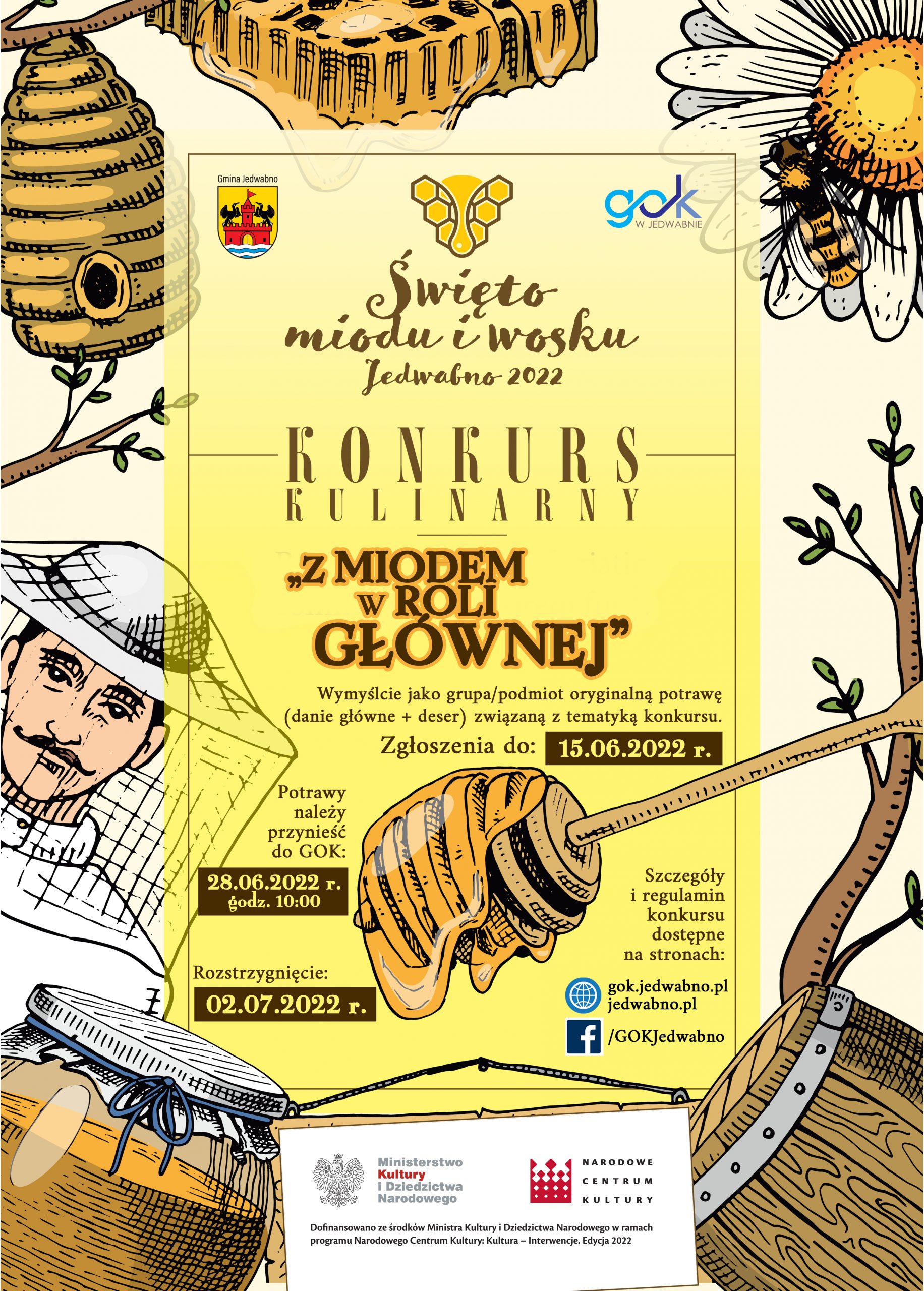 Zapraszamy do wzięcia udziału w konkursie kulinarnym pn. „Z MIODEM W ROLI GŁÓWNEJ”, którego organizatorem jest Gminny Ośrodek Kultury w Jedwabnie. Aby wziąć udział w konkursie należy opracować oryginalny przepis na danie + deser z miodem – jako główny składnik i przygotować zgodną z przepisem potrawę oraz deser. W pierwszej kolejności należy dostarczyć prawidłowo wypełnioną i podpisaną Kartę Zgłoszenia (do 15.06.2022 r.) W konkursie mogą wziąć udział grupy reprezentujące lokalne zrzeszenia nieformalne, stowarzyszenia, kluby, instytucje, sołectwa, koła gospodyń wiejskich z terenu Gminy Jedwabno. Gotowe potrawy i desery (podpisane na spodzie naczynia do serwowania) należy dostarczyć w dniu 28.06.2022 r., do godziny 10:00 do Gok Jedwabno.