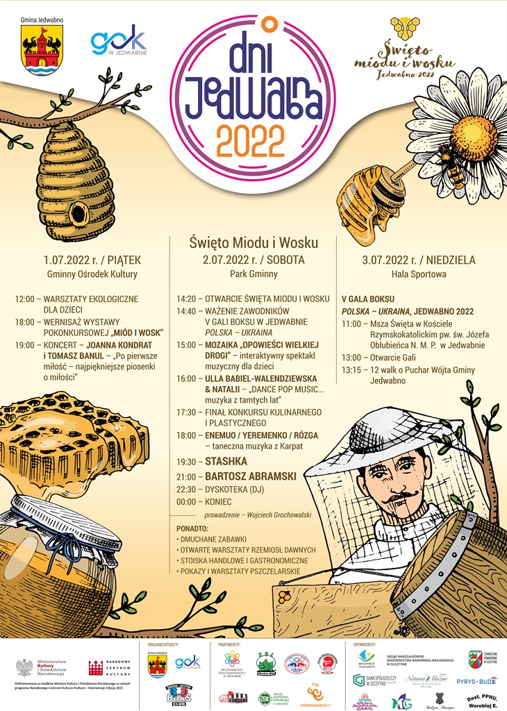 Dni Jedwabna to trzydniowe wydarzenie poświęcone celebracji założenia miejscowości, której początki związane są z bartnictwem. Piątkowe wydarzenia odbędą się pod znakiem ekologii, wieczorem natomiast zapraszamy do sali kinowej GOK na miłosny koncert Tomasza Banula i Joanny Kondrat. W sobotę będziemy obchodzić Święto Miodu i Wosku, podczas którego odbędą się koncerty muzyczne, pokazy i animacje dla dzieci. Nie zabraknie też stoisk handlowych i rękodzielniczych. Gwiazdami wieczoru będą STASHKA i BARTOSZ ABRAMSKI. W niedzielę zapraszamy na V Galę Boksu POLSKA – UKRAINA, na której zawodnicy stoczą 12 walk o Puchar Wójta Gminy Jedwabno. Szczegółowe informacje na plakacie.