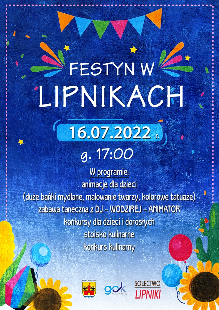 Już w najbliższą sobotę tj. 16.07.2022 r., w Lipnikach odbędzie się letni festyn. W programie m.in. animacje, konkursy i taneczna zabawa z dj. Zapraszamy!