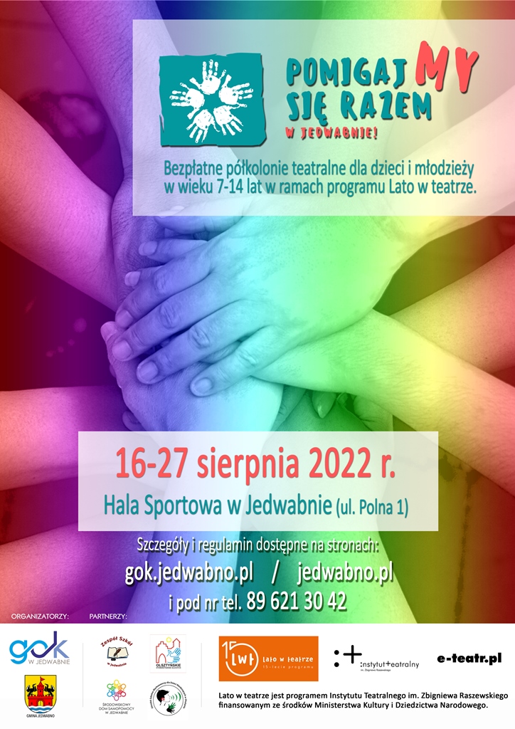„PomigajMY się razem w Jedwabnie”- Serdecznie zapraszamy do zapisów na bezpłatne półkolonie dla dzieci i młodzieży w wieku 7 -14 lat w ramach programu Lato w teatrze, które odbędą się w terminie 16-27 sierpnia 2022 r., w Hali Sportowej w Jedwabnie.