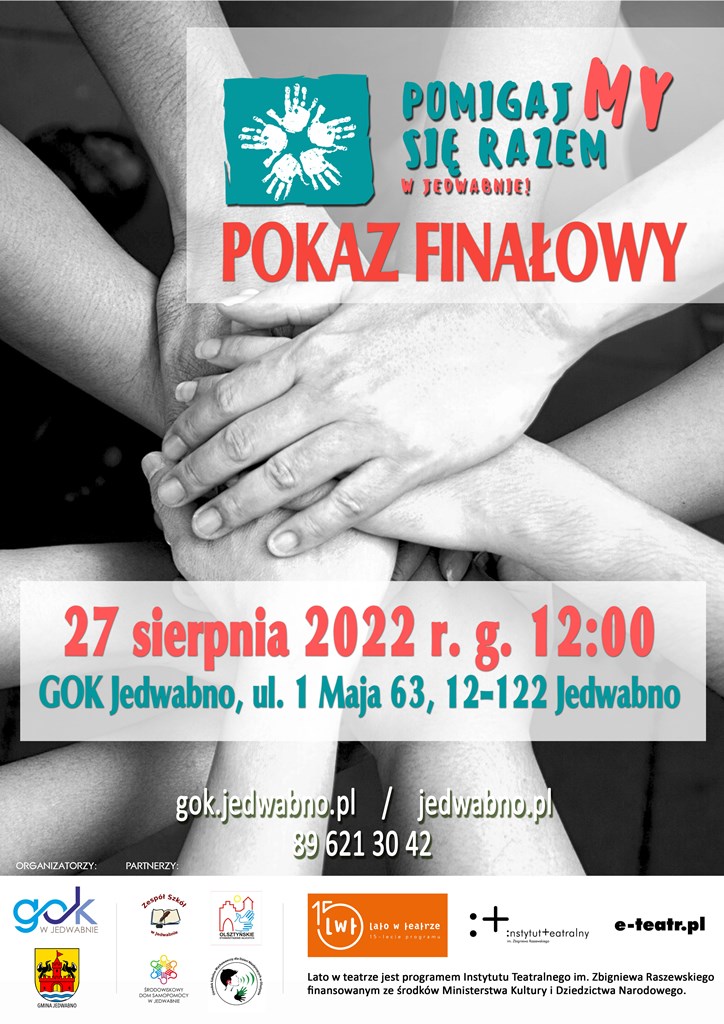 Zapraszamy na finałowy pokaz, który jest efektem dwutygodniowej pracy uczestników półkolonii pn. „PomigajMY się razem w Jedwabnie!” w ramach projektu Lato w teatrze Instytutu Teatralnego im. Zbigniewa Raszewskiego dofinansowanego przez Ministerstwo Kultury i Dziedzictwa Narodowego. Spektakl odbędzie się 27.08.2022 r. o godz. 12:00 w sali kinowej Gminnego Ośrodka Kultury w Jedwabnie.