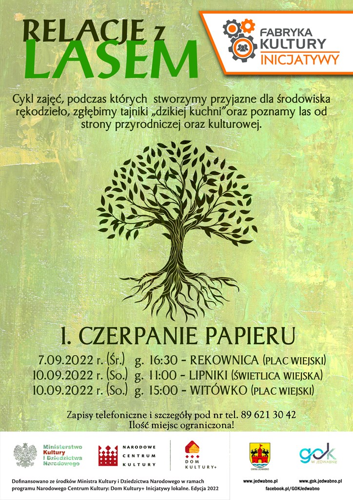 Zapraszamy na cykl zajęć pn. „Relacje z lasem”. To kolejna inicjatywa  FABRYKI KULTURY. Warsztaty odbędą się w miejscowościach: Rekownica, Lipniki i Witówko.