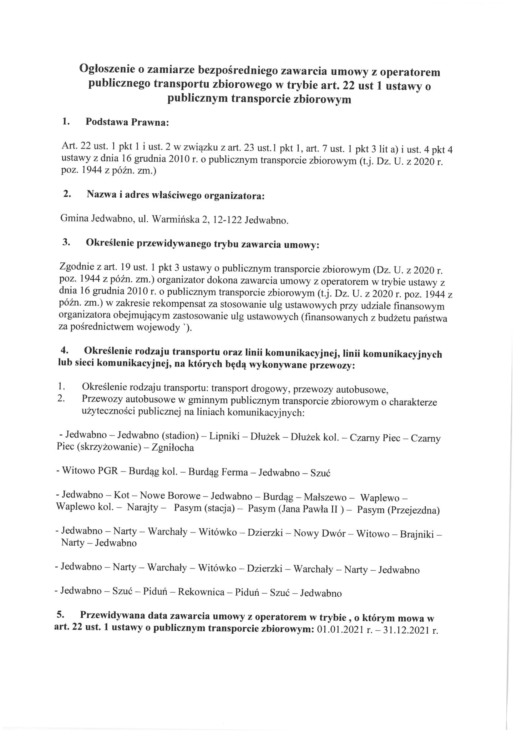 Ogłoszenie o zamiarze bezpośredniego zawarcia umowy z operatorem publicznego transportu zbiorowego w trybie art. 22 ust 1 ustawy o publicznym transporcie zbiorowym