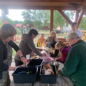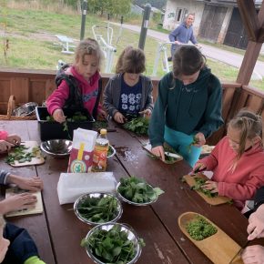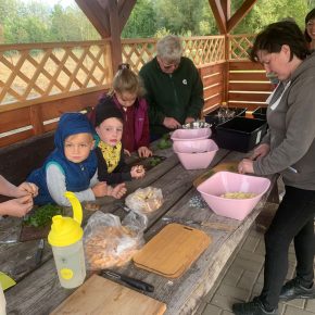 - Uczestncicy z Lipnik oprzygotowujący składniki do zupy w wiacie wiejskiej