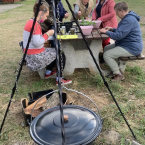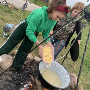 - Zdjęcie kociołka i uczestników przygotowujących potrawy przy stole