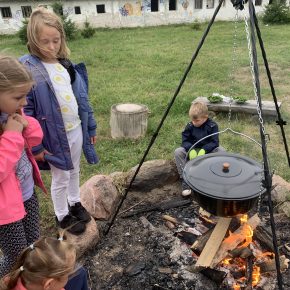 - Zdjęcie kociołka i patelni nad ogniskiem, w tle chłopiec podkłada drewno do ogniska.
