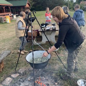 - Instruktorka mieszjająca wywar w kociołku – w tle – uczestcy z Rekownicy