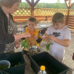 - Uczestncicy z Lipnik rwoący liście pokrzyw na mniejsze kawałki