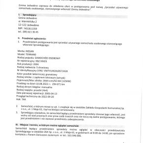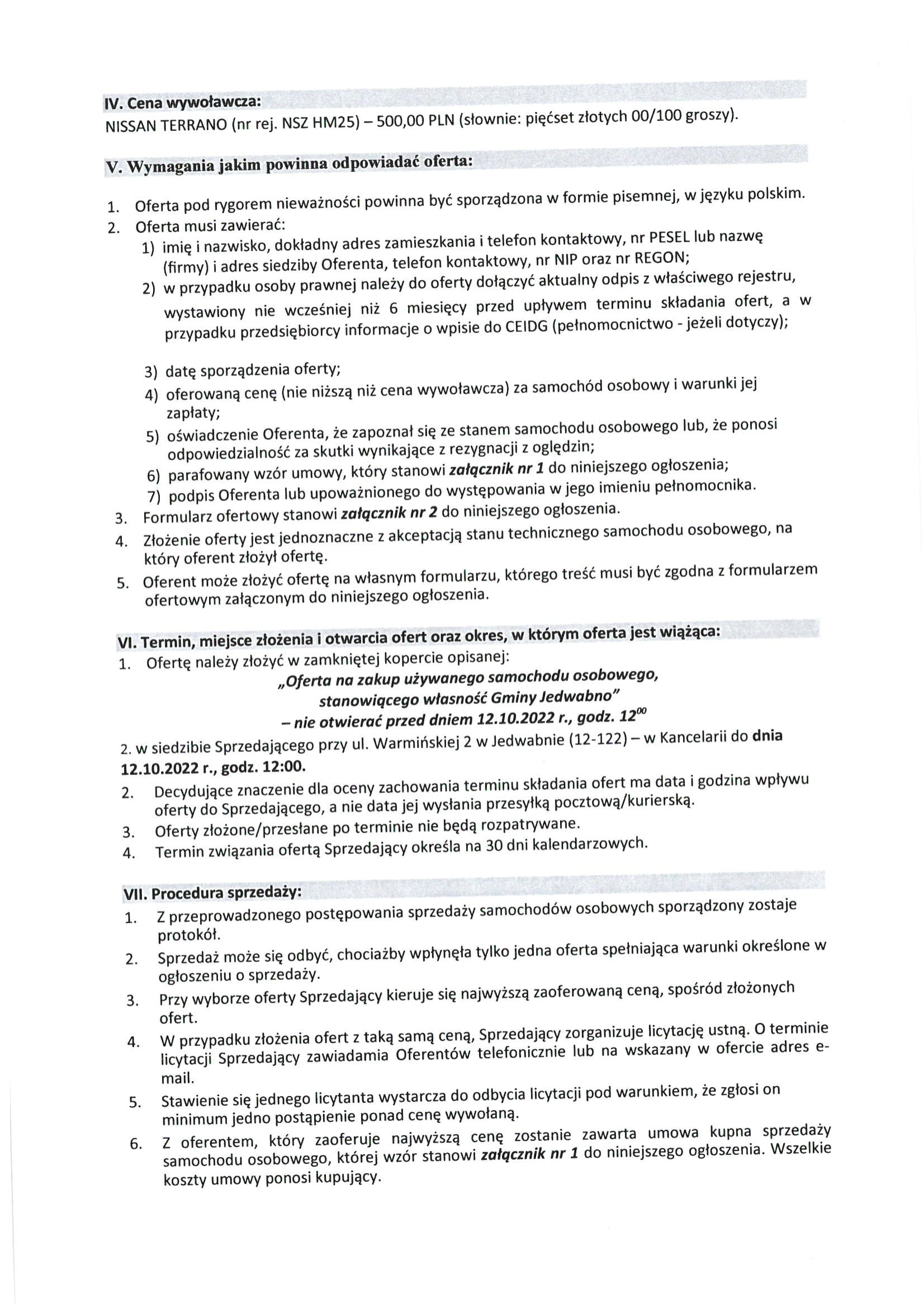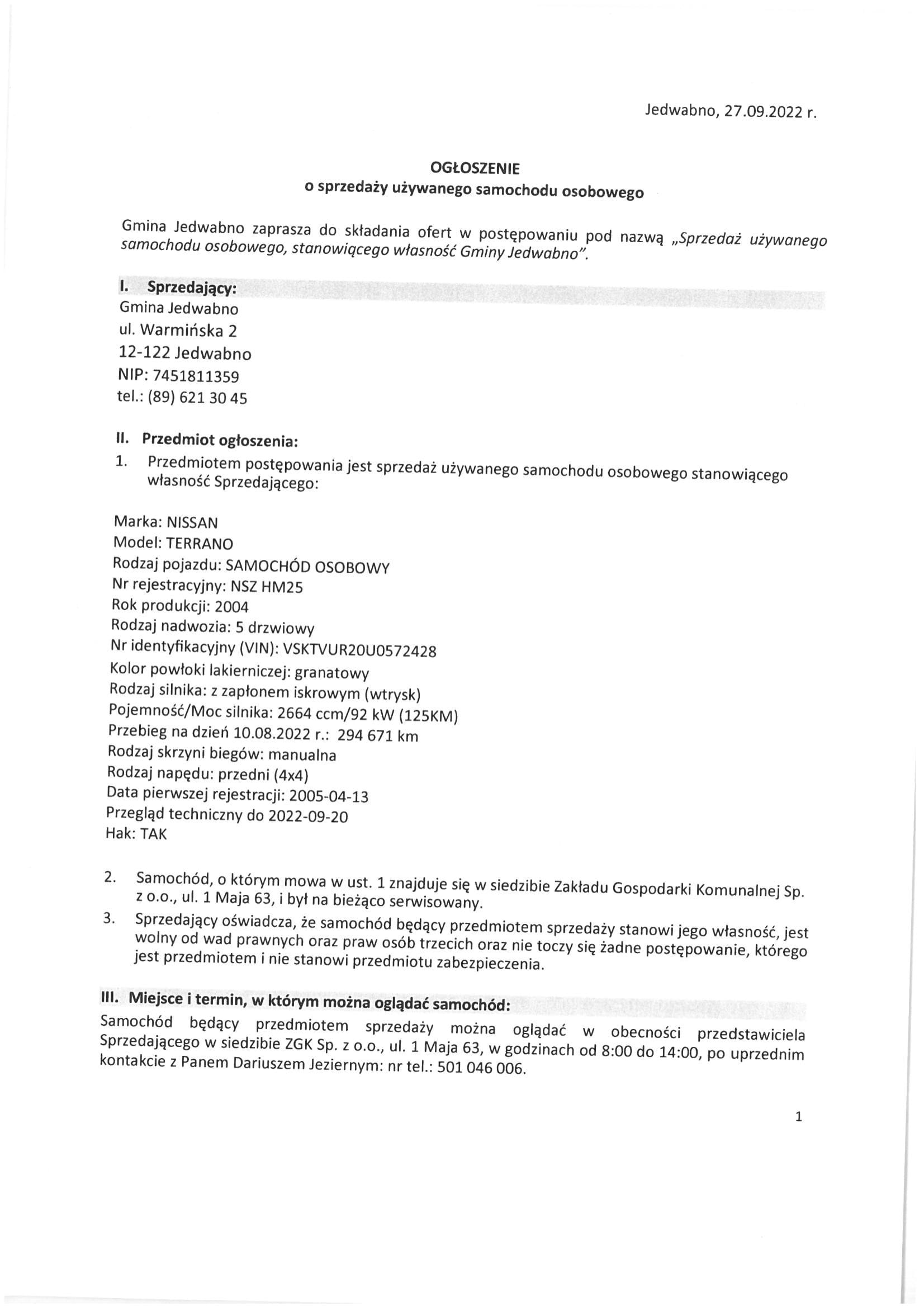 Gmina Jedwabno zaprasza do składania ofert w postępowaniu pod nazwą „Sprzedaż używanego samochodu osobowego, stanowiącego własność Gminy Jedwabno”