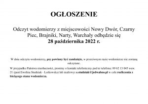 Odczyt wodomierzy z miejscowości Nowy Dwór, Czarny Piec, Brajniki, Narty, Warchały odbędzie się 28 października 2022 r.