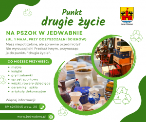 Szanowni Państwo, niedługo nastąpi oficjalne otwarcie nowo wybudowanego Punktu Selektywnej Zbiórki Odpadów Komunalnych w Jedwabnie, już teraz serdecznie zapraszamy do gminnego punktu rzeczy używanych, do którego przyjmiemy przedmioty w dobrym stanie, które mogą posłużyć innym bez konieczności skazywania ich na przysłowiowe wysypisko śmieci. Bardzo ważne aby dostarczane wyposażenie było w dobrym stanie technicznym, czyste, nieuszkodzone, niezagrażające kolejnym użytkownikom.