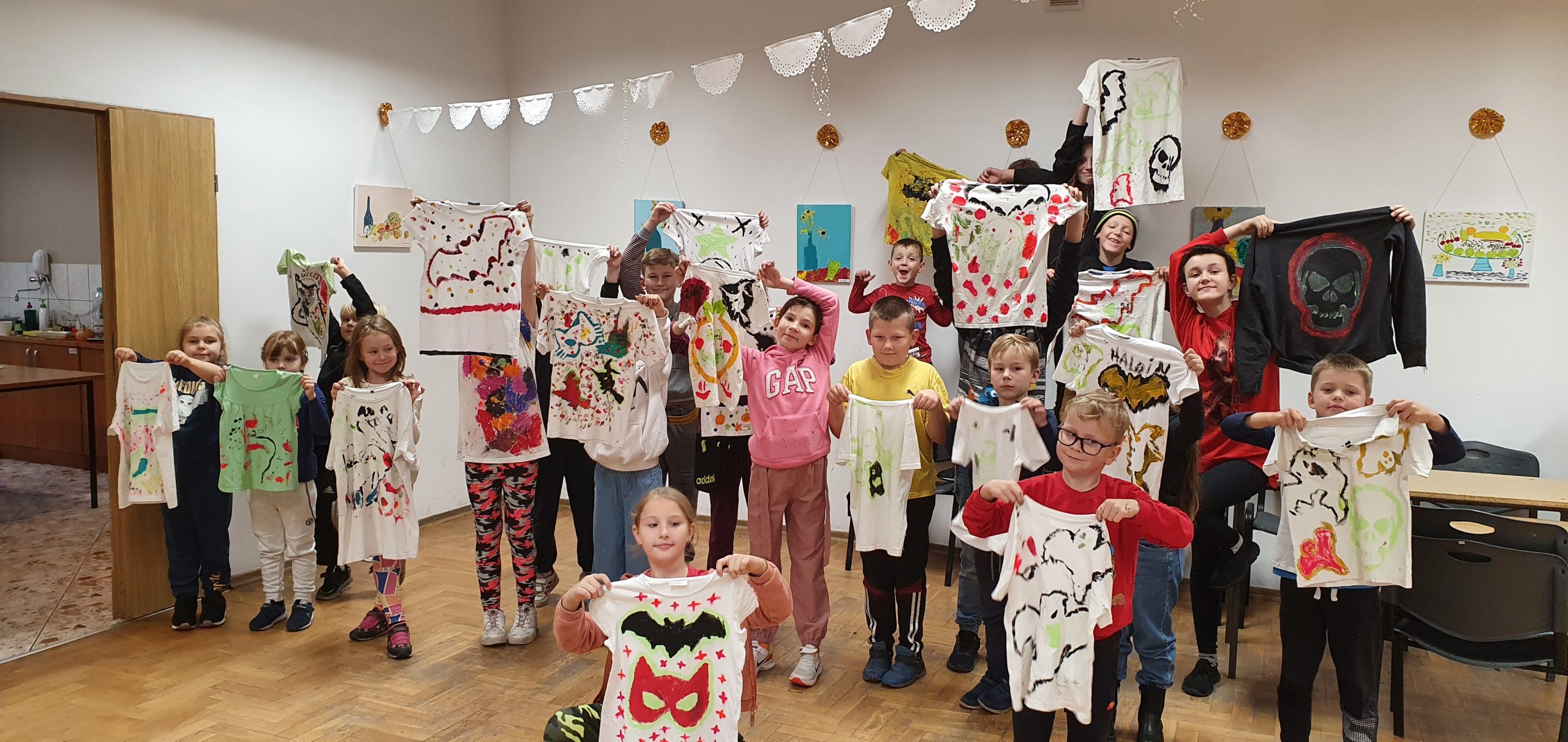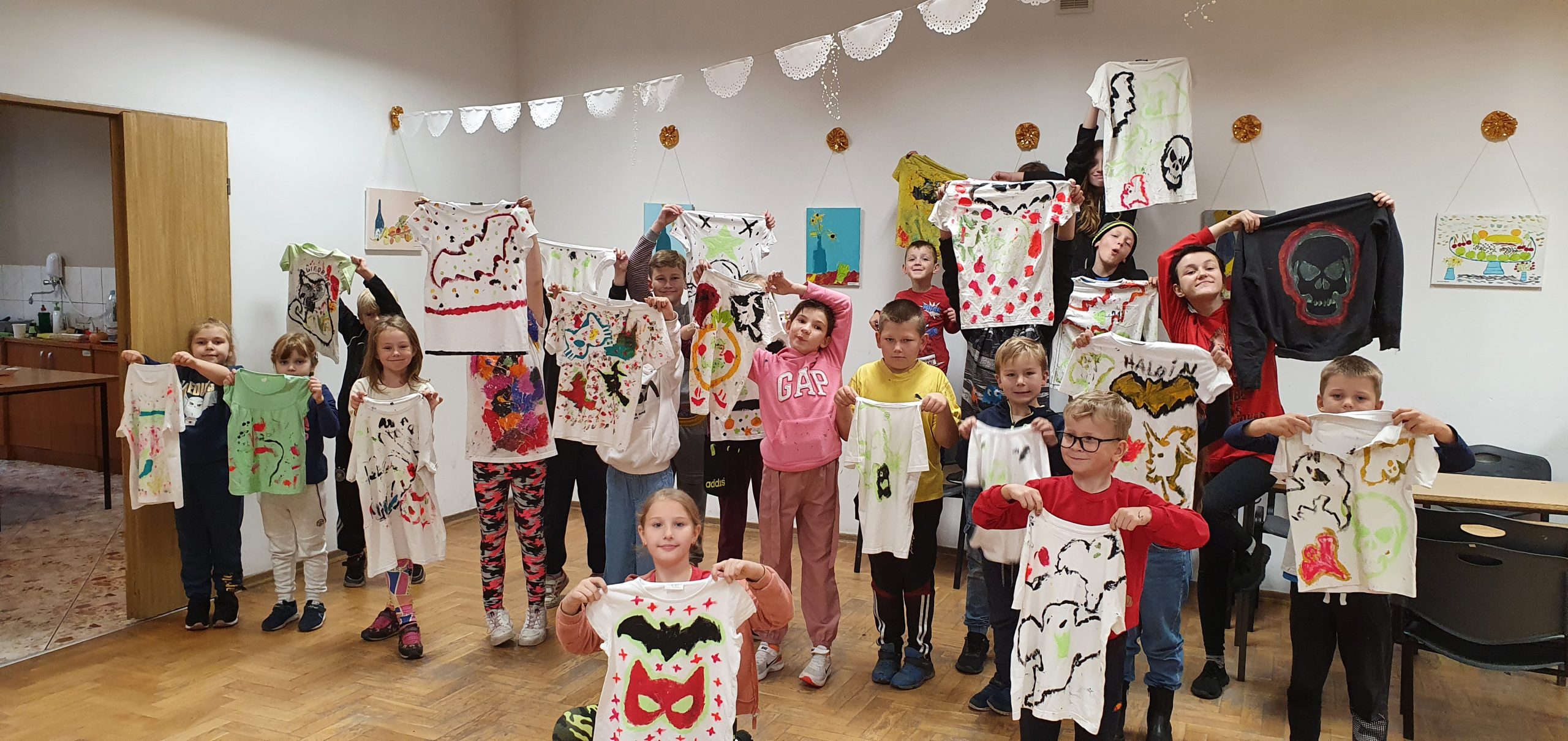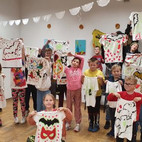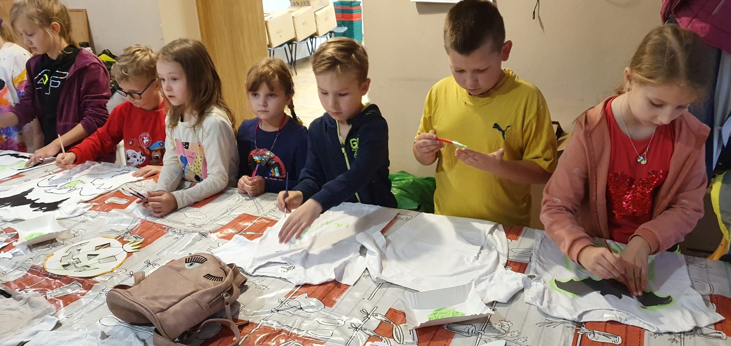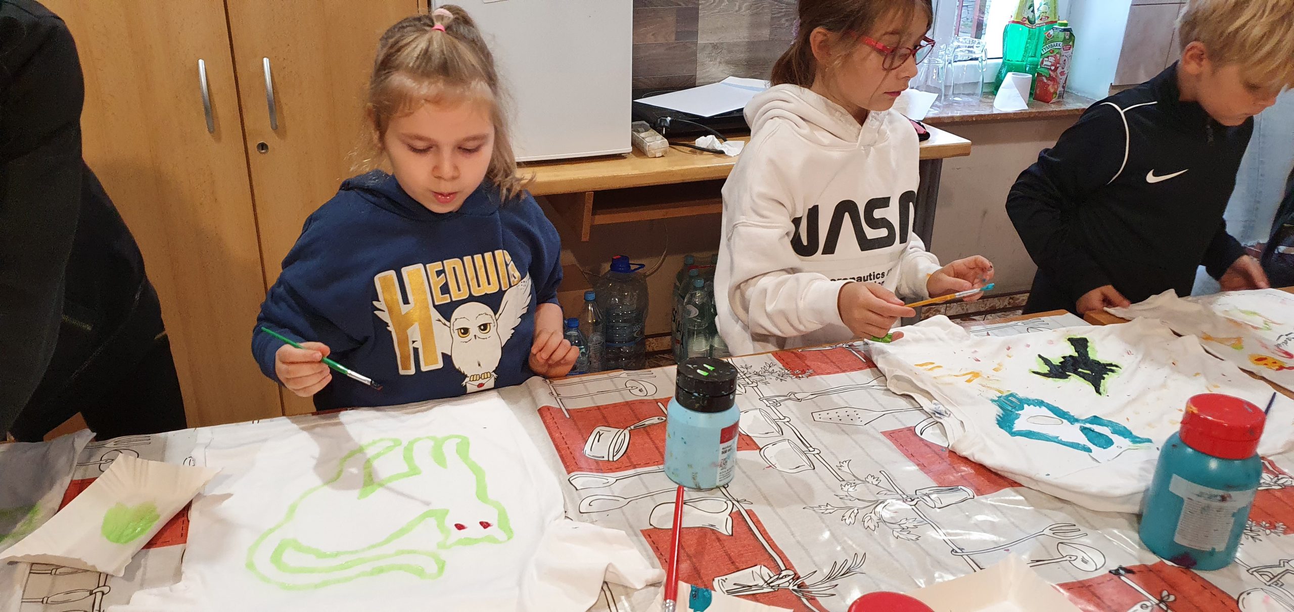 Wczoraj ( 18.10.2022 r.) gościliśmy liczną grupę dzieciaków na kolejnych zajęciach kreatywnych. Tym razem malowaliśmy koszulki farbami świecącymi w ciemności. Koszulki wykorzystamy na kolejnych zajęciach, na które już dziś serdecznie zapraszamy.
