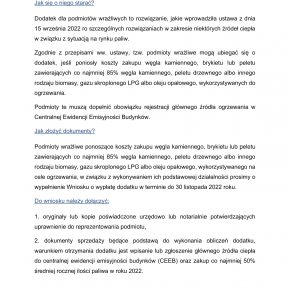 Zgodnie z przepisami ww. ustawy, tzw. podmioty wrażliwe mogą ubiegać się o dodatek, jeśli poniosły koszty zakupu węgla kamiennego, brykietu lub peletu zawierających co najmniej 85% węgla kamiennego, peletu drzewnego albo innego rodzaju biomasy, gazu skroplonego LPG albo oleju opałowego, wykorzystywanych do ogrzewania.