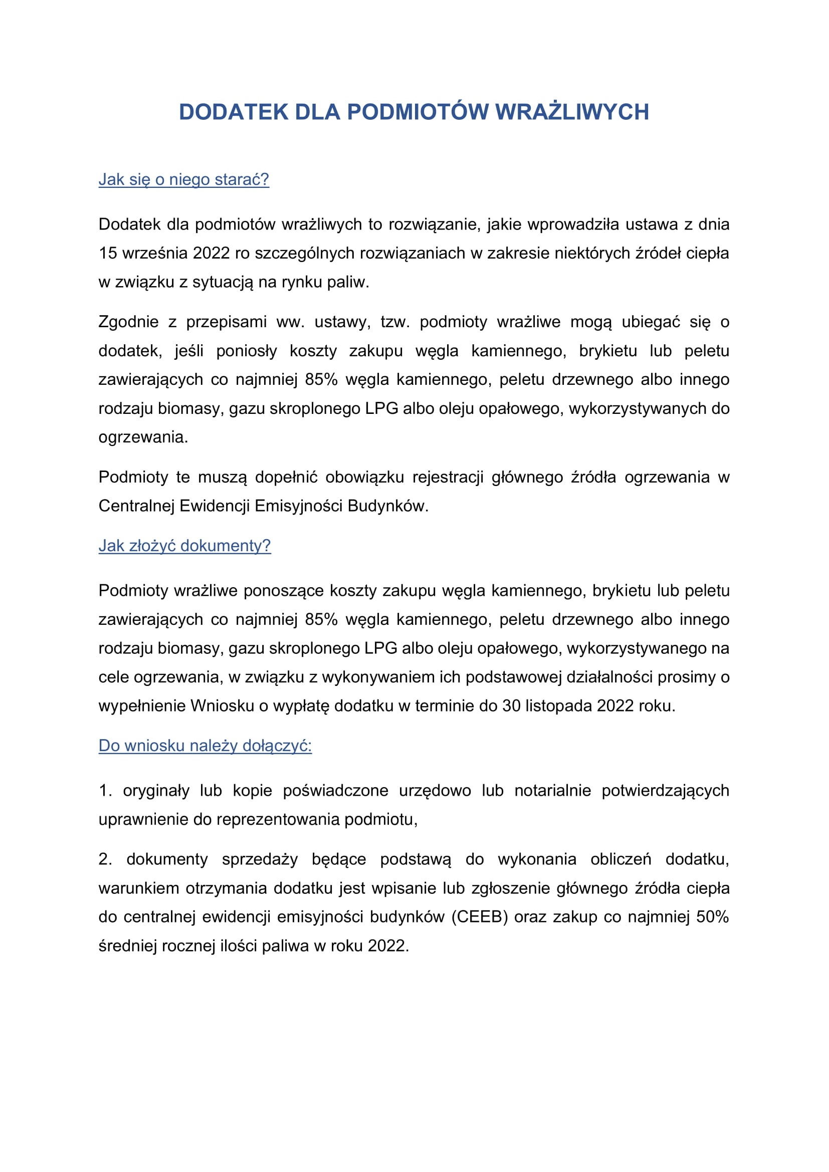 Dodatek dla podmiotów wrażliwych to rozwiązanie, jakie wprowadziła ustawa z dnia 15 września 2022 ro szczególnych rozwiązaniach w zakresie niektórych źródeł ciepła w związku z sytuacją na rynku paliw.