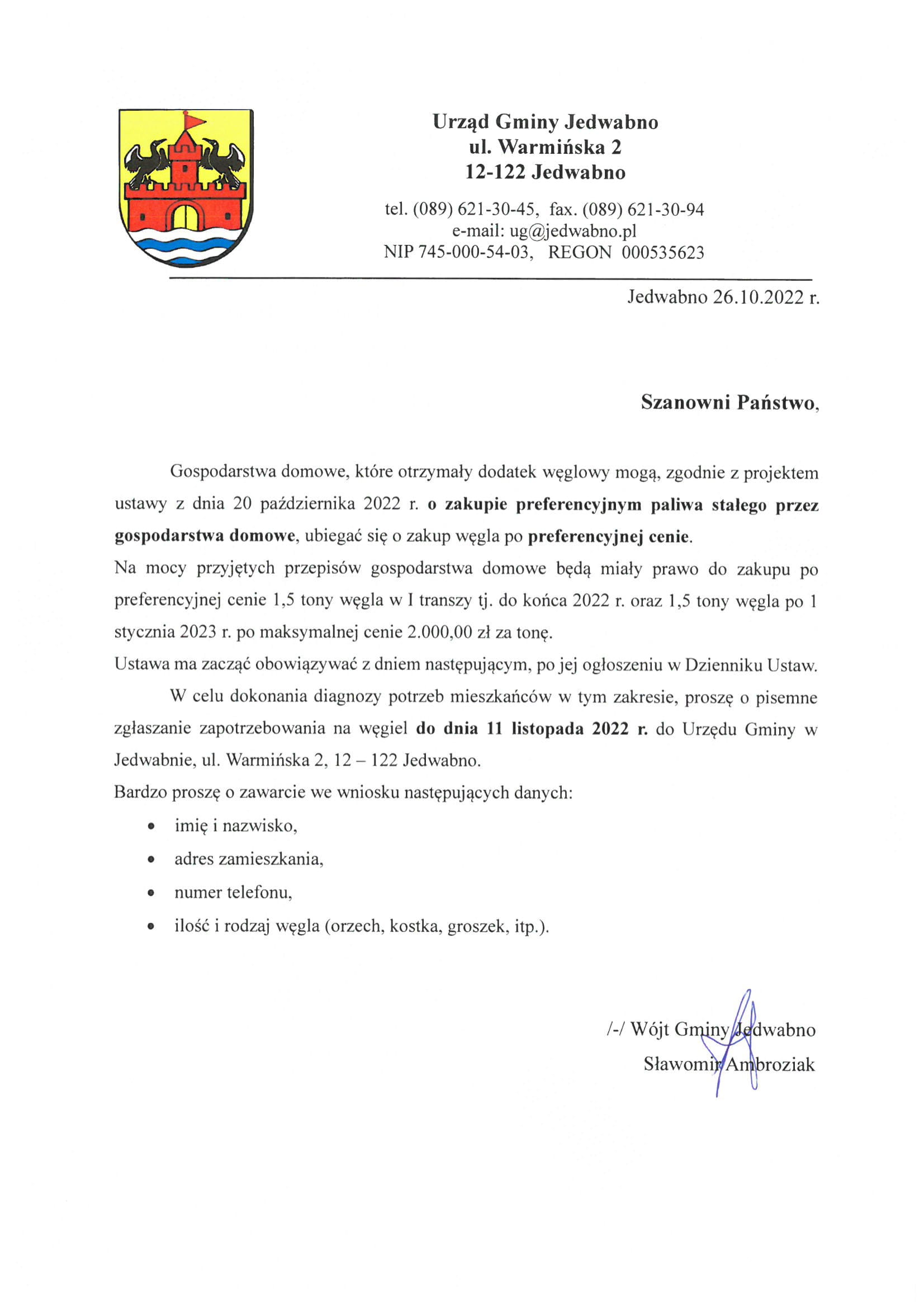Gmina Jedwabno włączyła się do sprzedaży węgla dla mieszkańców w cenie do 2 tysięcy złotych.