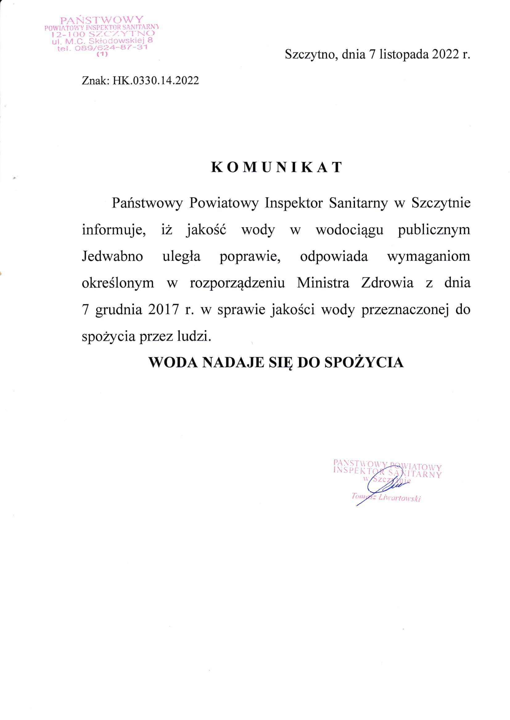 Komunikat Powiatowej Stacji Sanitarno-Epidemiologicznej w Szczytnie o poprawie jakości wody do spożycia w wodociągu publicznym Jedwabno.