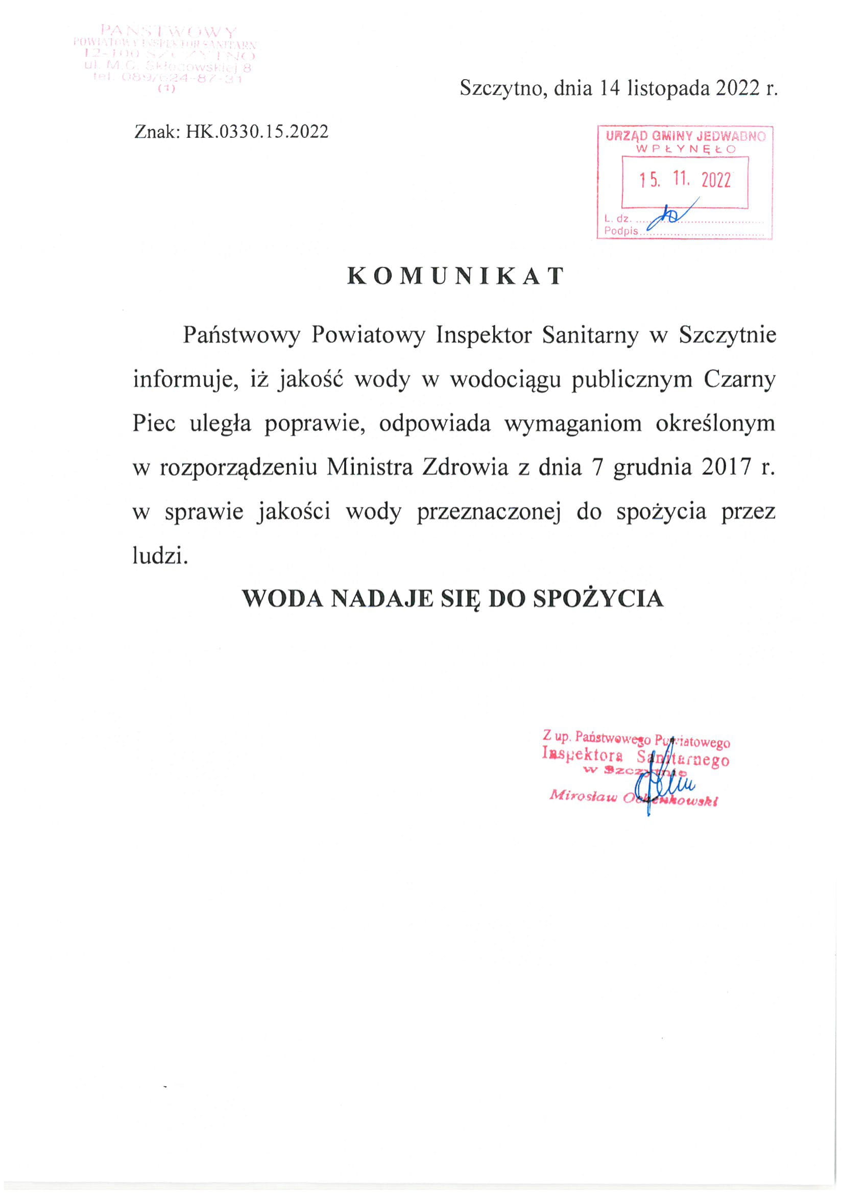 3. Komunikat odnośnie jakości wody w wodociągu publicznym Czarny Piec