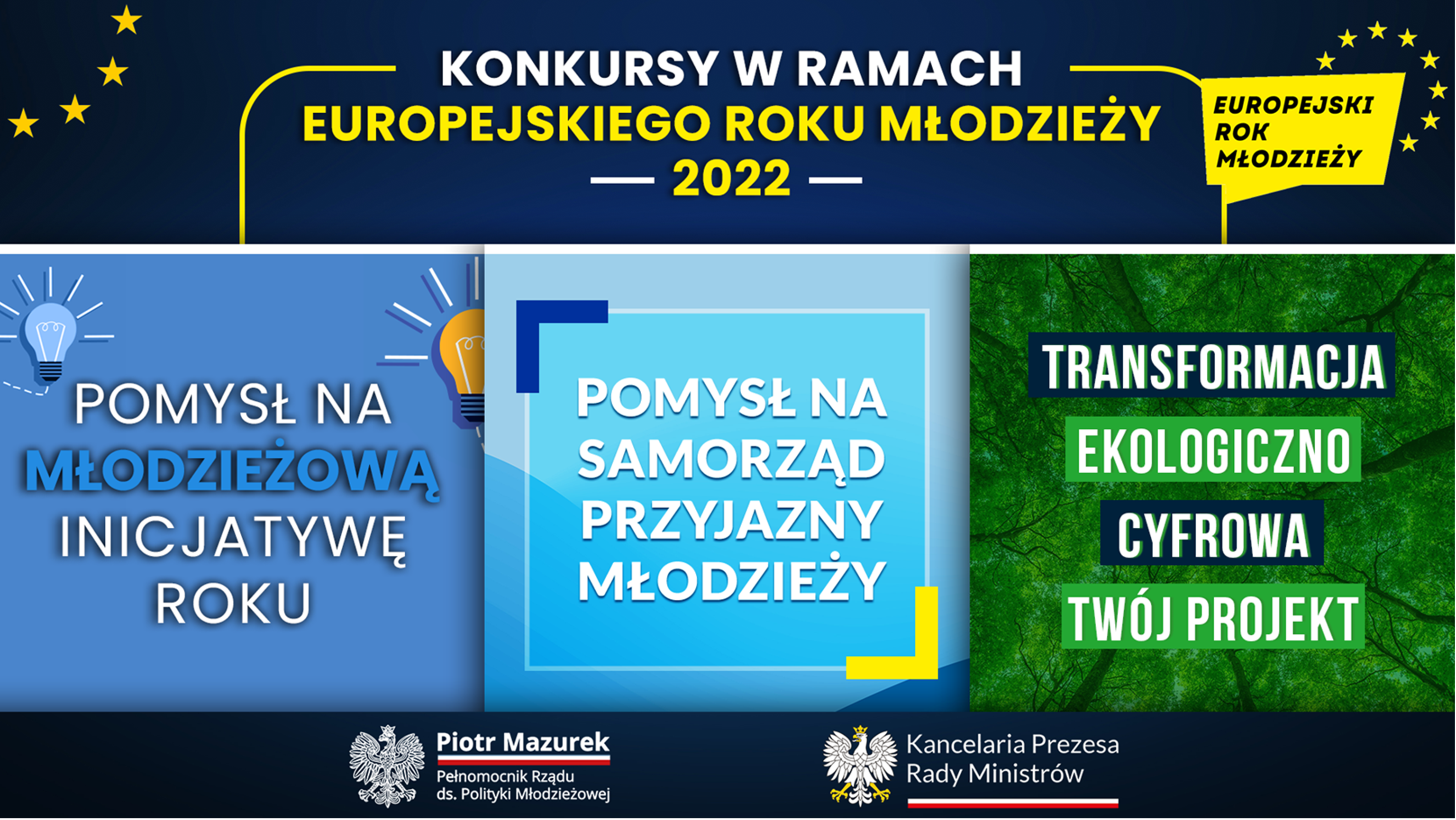 w związku z trwającym Europejskim Rokiem Młodzieży – Kancelaria Prezesa Rady Ministrów zaprasza serdecznie do udziału w 3 konkursach, w których przewidziane są atrakcyjne nagrody, a których wręczenie odbędzie się w budynku KPRM.