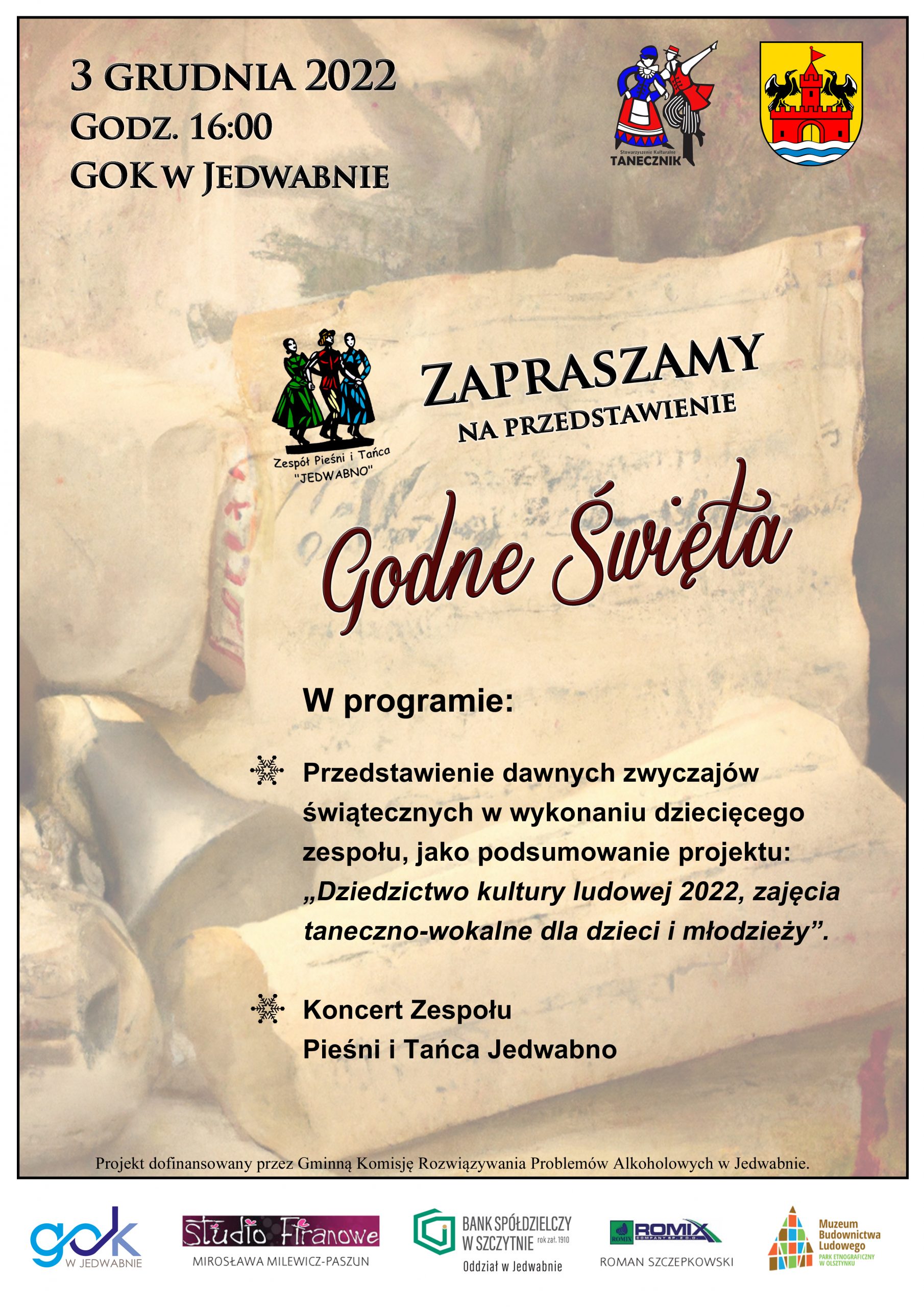 W imieniu Organizatora – Zespołu Pieśni i Tańca Jedwabno serdecznie zapraszamy na przedstawienie pt. „Godne Święta”, które odbędzie się 3 grudnia 2022, o godz. 16:00 w sali kinowej Gminnego Ośrodka Kultury w Jedwabnie. Więcej informacji na plakacie poniżej.
