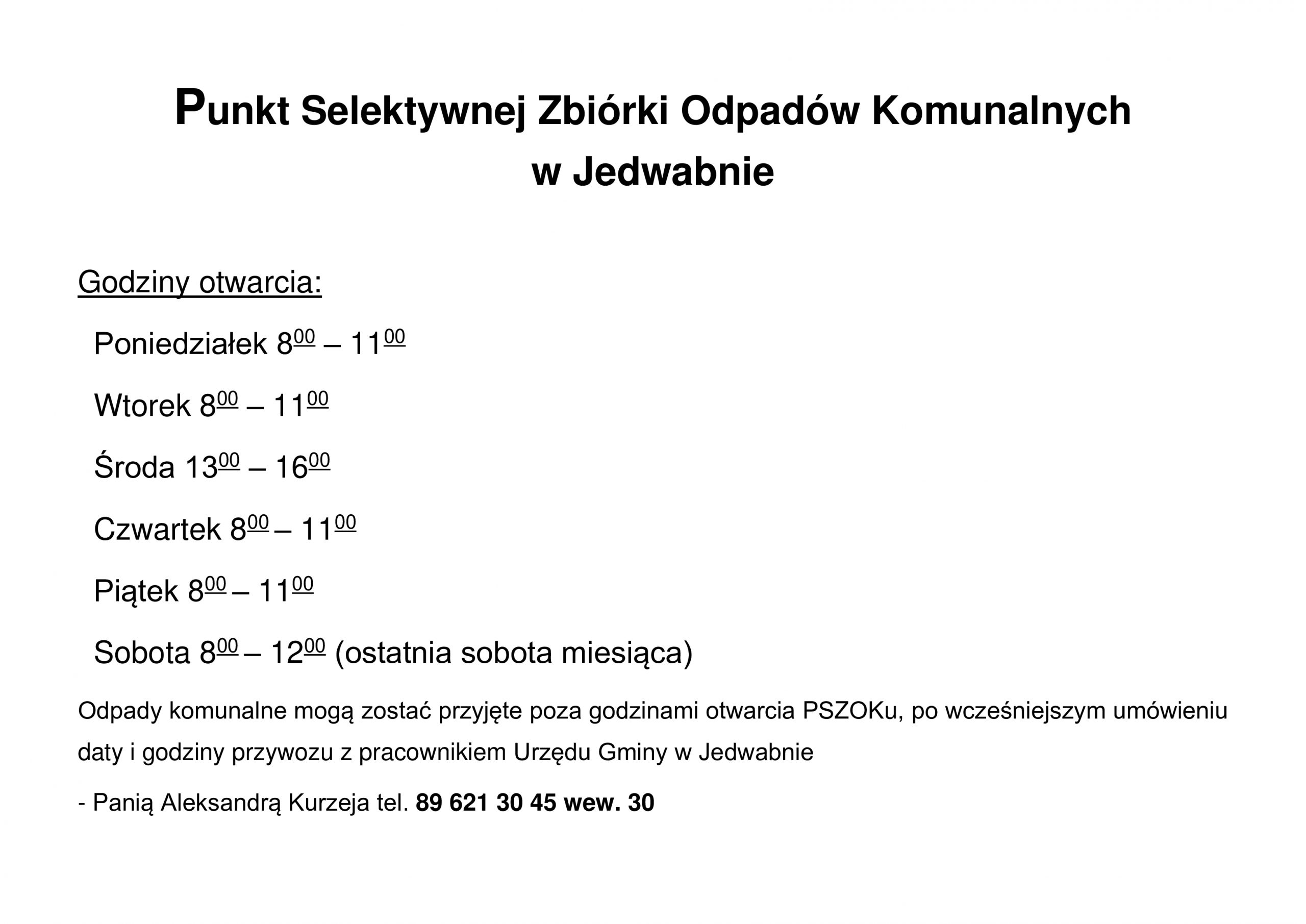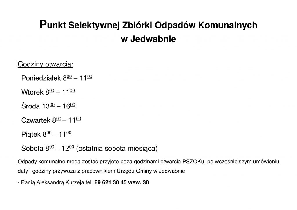 Informacja w sprawie Punktu Selektywnej Zbiórki Odpadów Komunalnych w Jedwabnie.