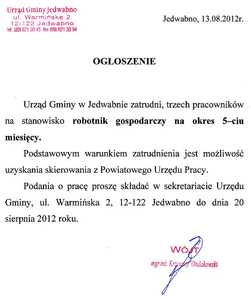 Urząd Gminy w Jedwabnie ul. Warmińska 2, tel. 89/6213045, fax. 6213094, |ug@jedwabno.pl