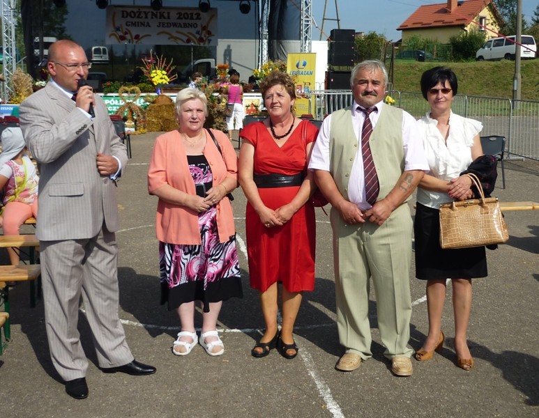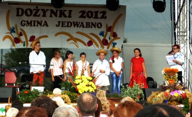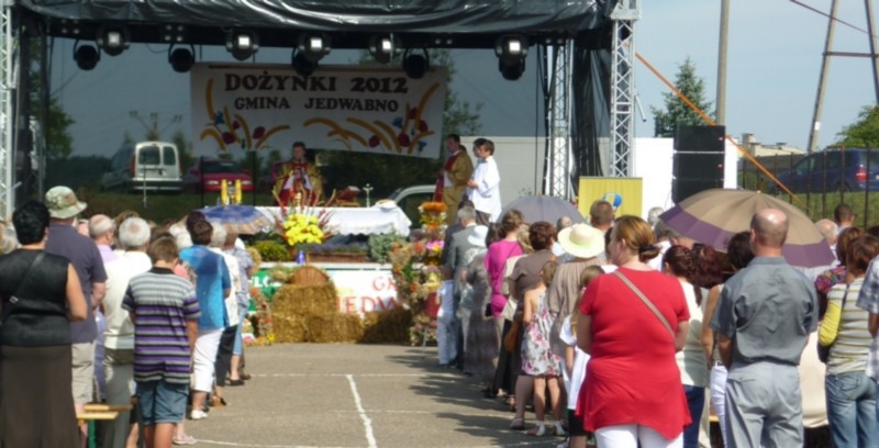 Uroczystość dożynkowa w tym roku, podobnie jak w roku ubiegłym, miała miejsce na stadionie sportowym w Jedwabnie. Rozpoczął ją korowód dożynkowy, który wyruszył spod budynku Urzędu Gminy. Na uroczystą mszę dożynkową, odprawianą przez nowego Proboszcza Parafii w Jedwabnie, Romana Lompę, przybył Starosta Szczycieński Jarosław Matłach, poseł na sejm RP Jerzy Szmit, Wójt Gminy Szczytno Sławomir Wojciechowski, oraz Burmistrz Miasta Pasym Bernard Mius oraz Przewodniczący Rad i Państwo Radni z terenu całego powiatu szczycieńskiego. Najważniejszymi gośćmi uroczystości byli rolnicy i ich rodziny z terenu naszej gminy. Po mszy dziękczynnej za zebrane plony oraz inscenizacji obyczaju dożynkowego w wykonaniu Zespołu Pieśni i Tańca Jedwabno wójt Krzysztof Otulakowski przyjął od Starostów dożynek (Marianny i Jana Barańskich z Szuci) chleb dożynkowy upieczony z tegorocznego ziarna. Wójt podziękował za ten symboliczny dar, a także za piękne, misternie wykonane wieńce dożynkowe. Podziękował wszystkim rolnikom za ich ciężką pracę, dzięki której codziennie trafia na nasze stoły chleb. Podkreślił, że wielu ludziom trudno jest docenić pracę rolników, a przecież właśnie ta praca jest podstawą egzystencji ludzi. Zacytował przy tym słowa Jana Pawła II: