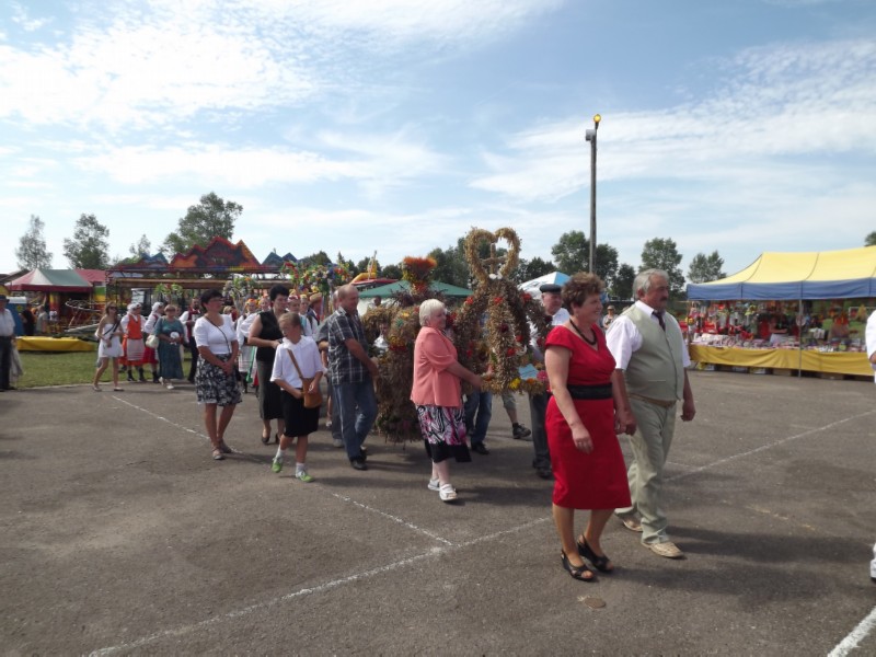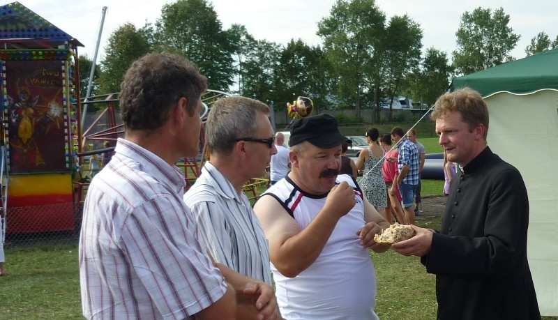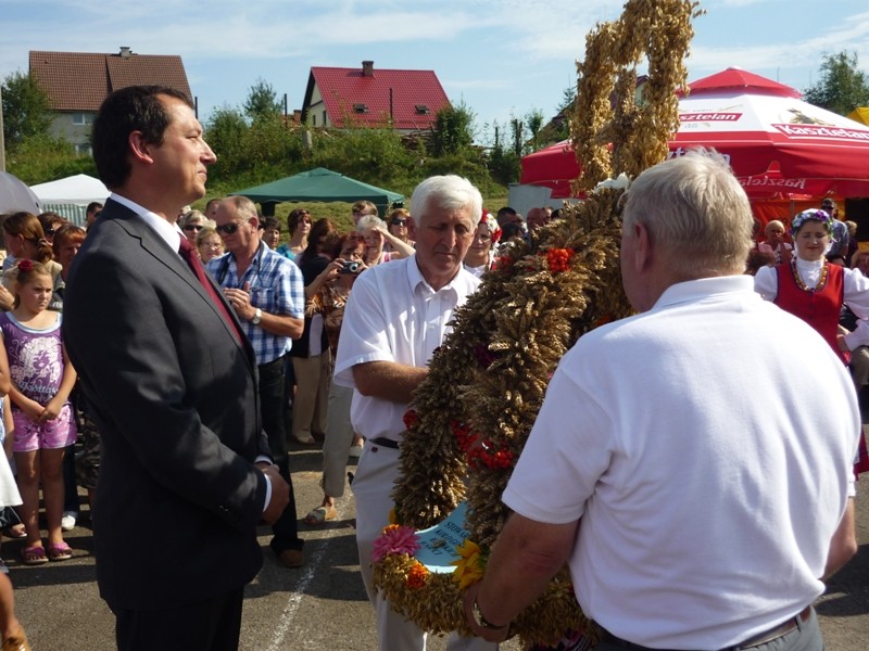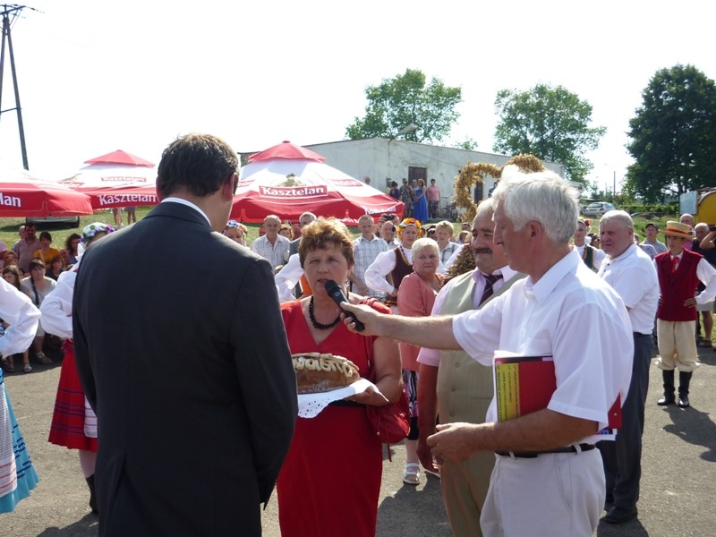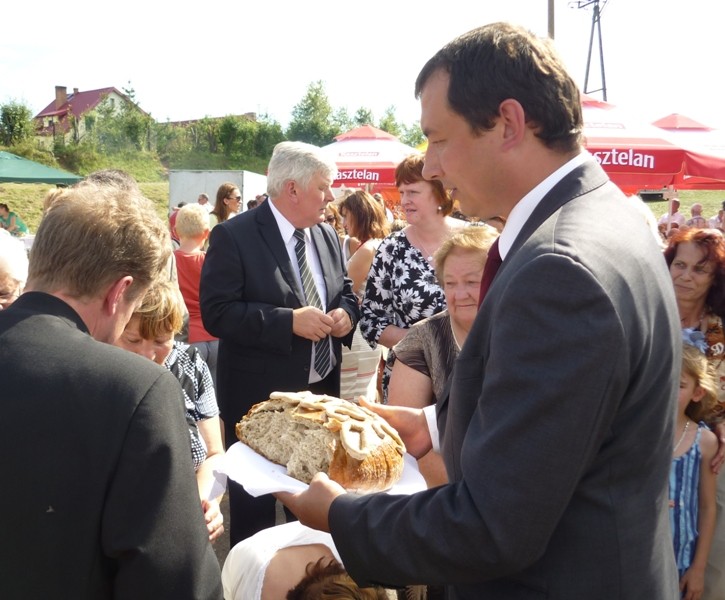 ?Oddaję hołd spracowanym rękom polskiego rolnika. Tym rękom, które z trudnej ciężkiej ziemi wydobywały chleb dla kraju, a w chwilach zagrożenia były gotowe tej ziemi strzec i bronić.? Wójt Krzysztof Otulakowski życzył rolnikom dużo zdrowia i pomyślności oraz aby korzystali z nowych możliwości i szans. Do życzeń tych dołączył się również Starosta Powiatu Szczycieńskiego Jarosław Matłach, który także podkreślił ważną rolę rolników, podziękował za ich trud oraz zaangażowanie jakie wkładają w pracę oraz życzył zawsze udanych plonów. Następnie gospodarz dożynek Krzysztof Otulakowski poprosił proboszcza Romana Lompę o wspólne dzielenie chlebem ze wszystkimi mieszkańcami oraz gośćmi, którzy tego dnia uczestniczyli w uroczystości.