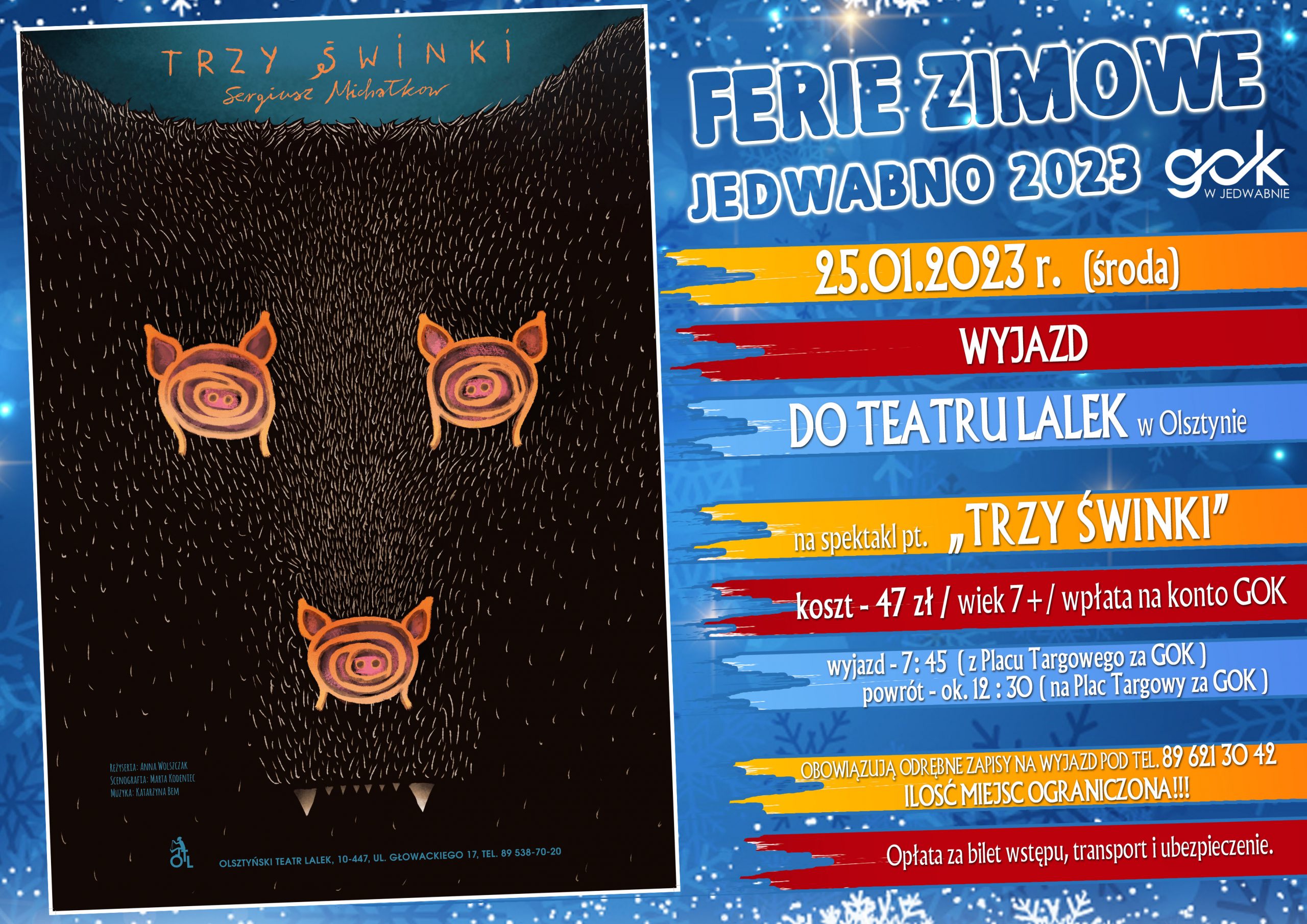 W ramach Ferii Zimowych organizowanych przez Gminny Ośrodek Kultury w Jedwabnie planowana jest wycieczka do Teatru Lalek w Olsztynie na spektakl pt. „TRZY ŚWINKI”. Koszt wycieczki to 47 zł (cena obejmuje bilet wstępu, transport i ubezpieczenie). Obowiązują odrębne zapisy na wycieczkę, które przyjmujemy telefonicznie pod nr 896213042 lub osobiście w godzinach pracy GOK-u. Wpłaty prosimy kierować na rachunek bankowy GOK w Jedwabnie 48 8838 1015 2004 0105 7772 0001 (Bank Spółdzielczy w Szczytnie, oddział w Jedwabnie) do dnia 23.01.2023 r. Wycieczka skierowana jest do dzieci w wieku 7+. Planowany wyjazd z Placu Targowego w Jedwabnie dnia 25.01.2023 r. o godz. 7:45, powrót w to samo miejsce ok. godz. 12:30 (godziny mogą ulec zmianie). Formularz zgłoszeniowy należy dostarczyć do GOK-u przed wyjazdem. Wzór formularza dostępny poniżej.