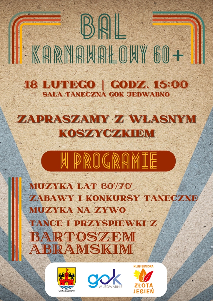 Serdecznie zapraszamy na Bal Karnawałowy 60 +, który odbędzie się 18 lutego 2023 r., w Gminnym Ośrodku Kultury w Jedwabnie (sala taneczna). Start godz. 15:00. Więcej informacji na plakacie poniżej.