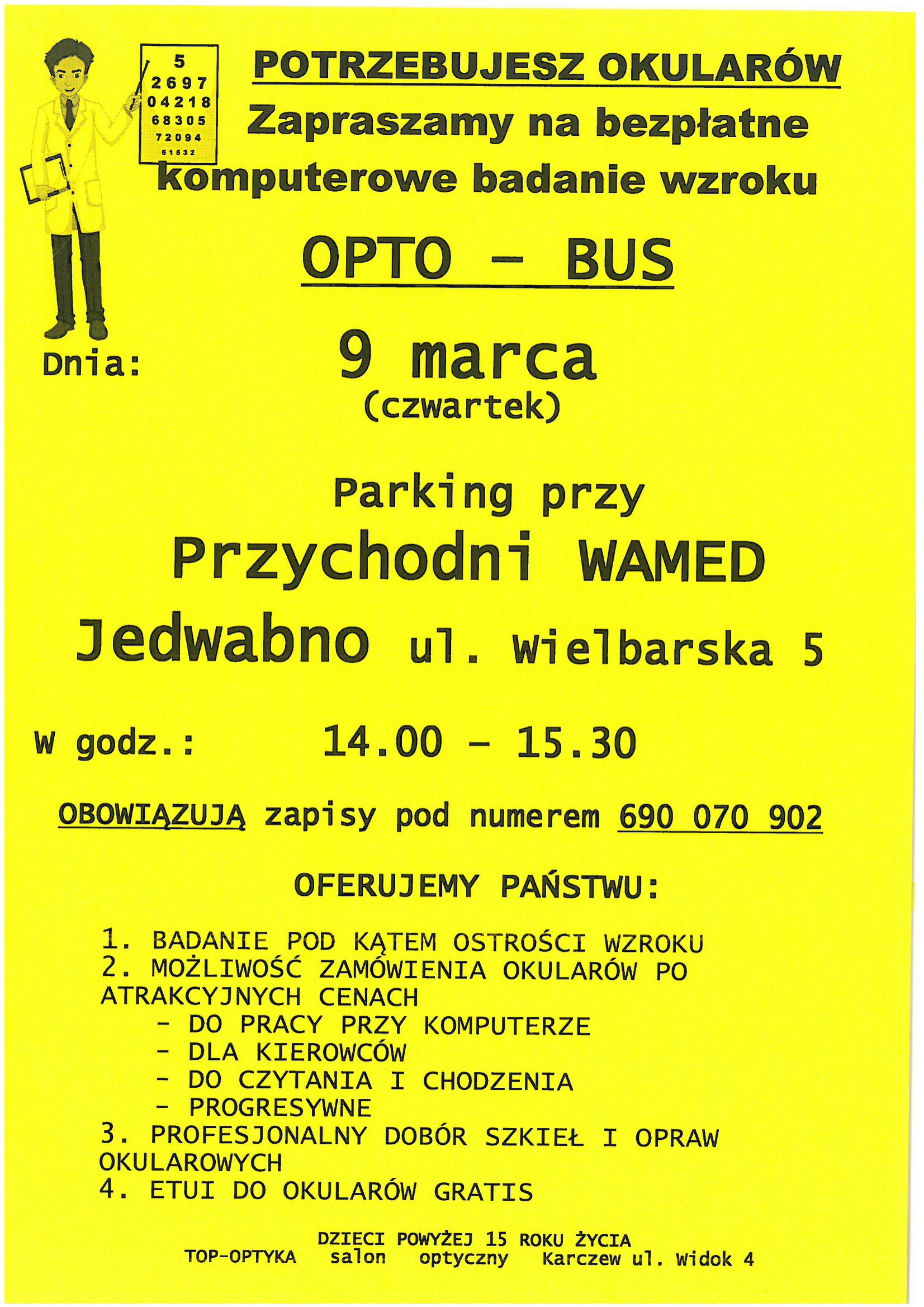 Szanowni Państwo, zapraszamy na bezpłatne komputerowe badanie wzroku z OPTO-BUS dnia 9 marca (czwartek) parking przy Przychodni Wamed Jedwabno ul. Wielbarska 5 w godzinach 14:00-15:30 .