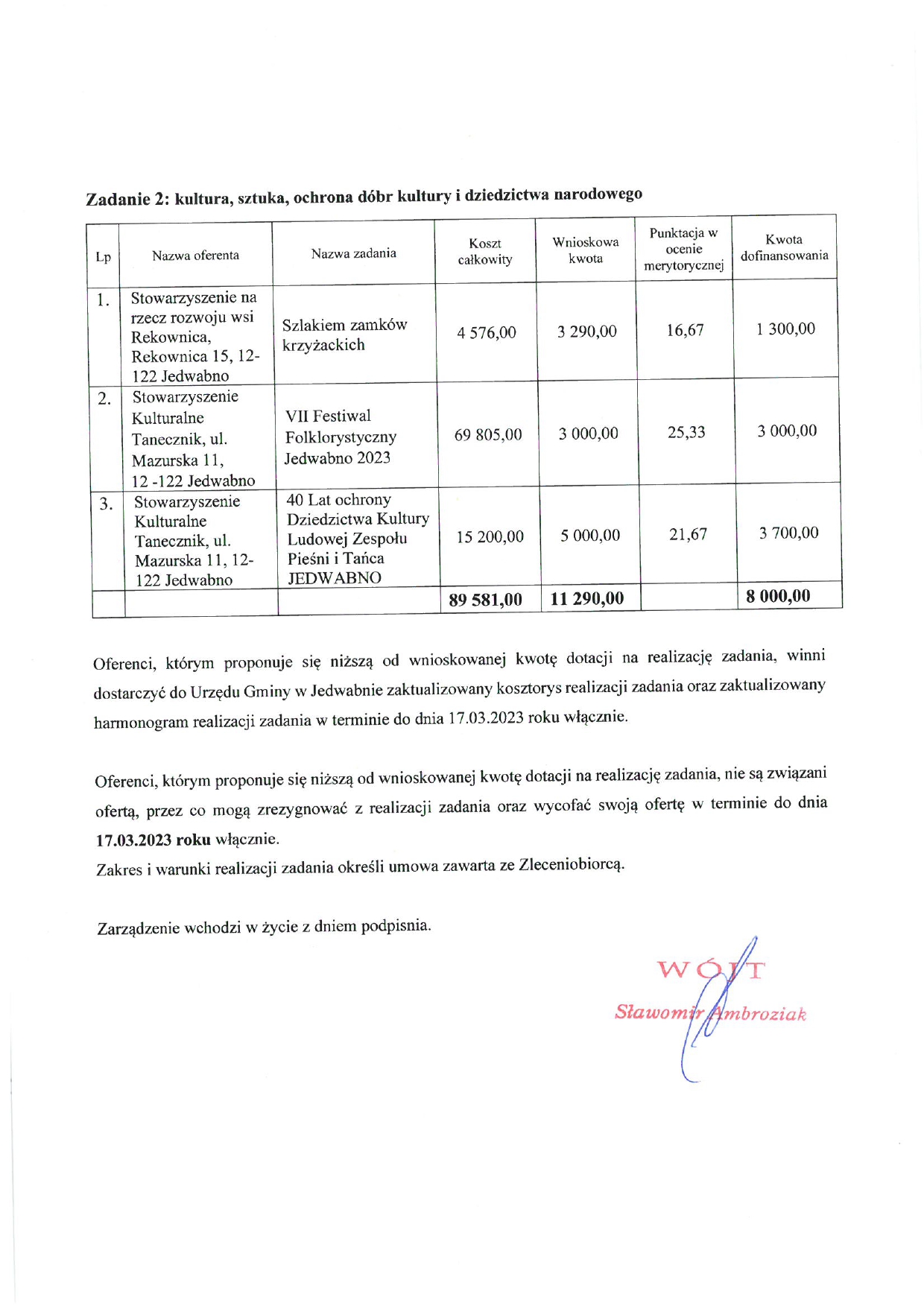 Zarządzenie w sprawie wyboru ofert w otwartym konkursie ofert na realizację zadań publicznych w 2023 roku.