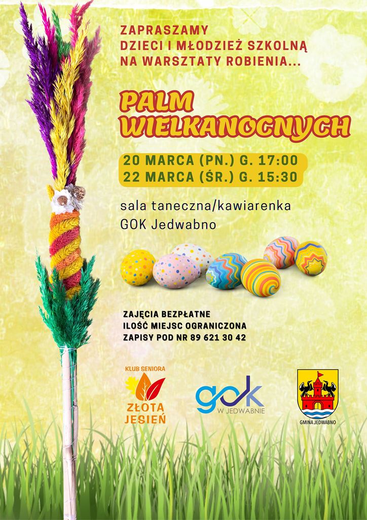 Serdecznie zapraszamy dzieci i młodzież szkolną na warsztaty robienia palm wielkanocnych, które odbędą się 20 marca (poniedziałek) o godz. 17:00 oraz 22 marca (środa) godz. 15:30 w Gminnym Ośrodku Kultury w Jedwabnie. Zajęcia są bezpłatne, ilość miejsc ograniczona. Obowiązują zapisy pod nr tel. 89 621 3042. Więcej informacji na poniższym plakacie.