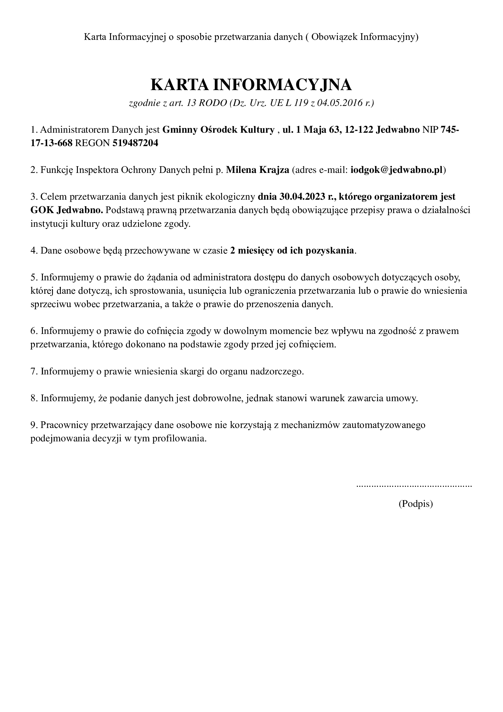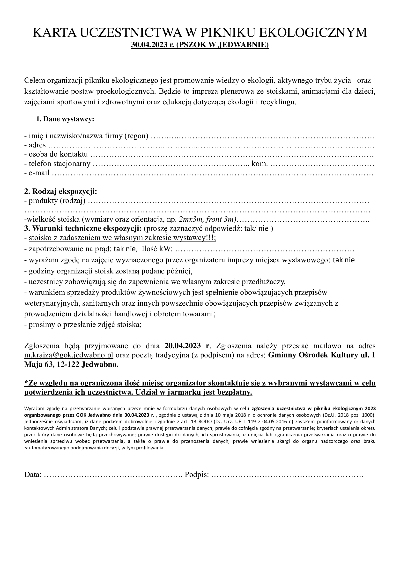 Poniżej znajduje się karta uczestnictwa oraz karta informacyjna. Należy je pobrać i wypełnić. Wypełnione karty prosimy wysłać skanem na adres e-mail: [email protected] oraz na adres Gminnego Ośrodka Kultury w Jedwabnie ul. 1-go Maja 63 12-122 Jedwabno.