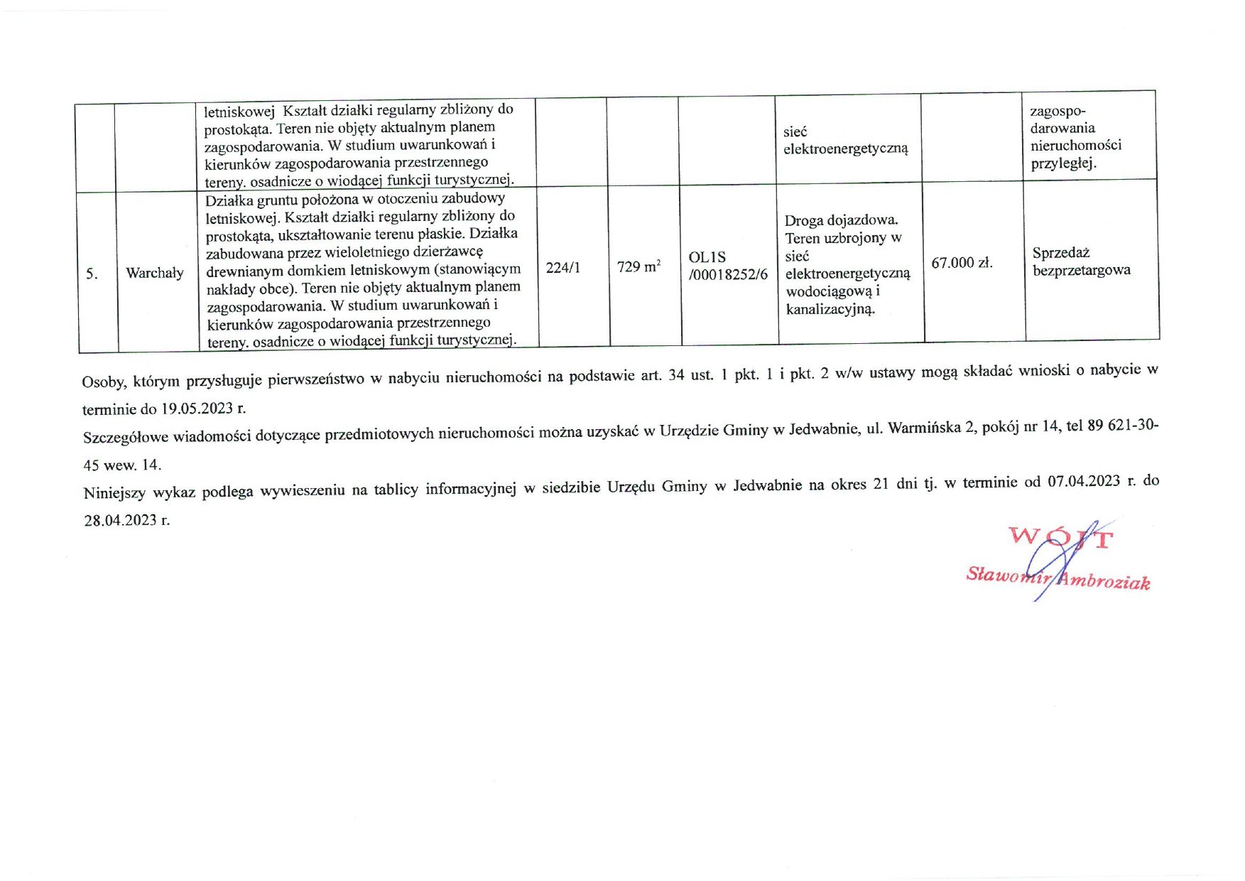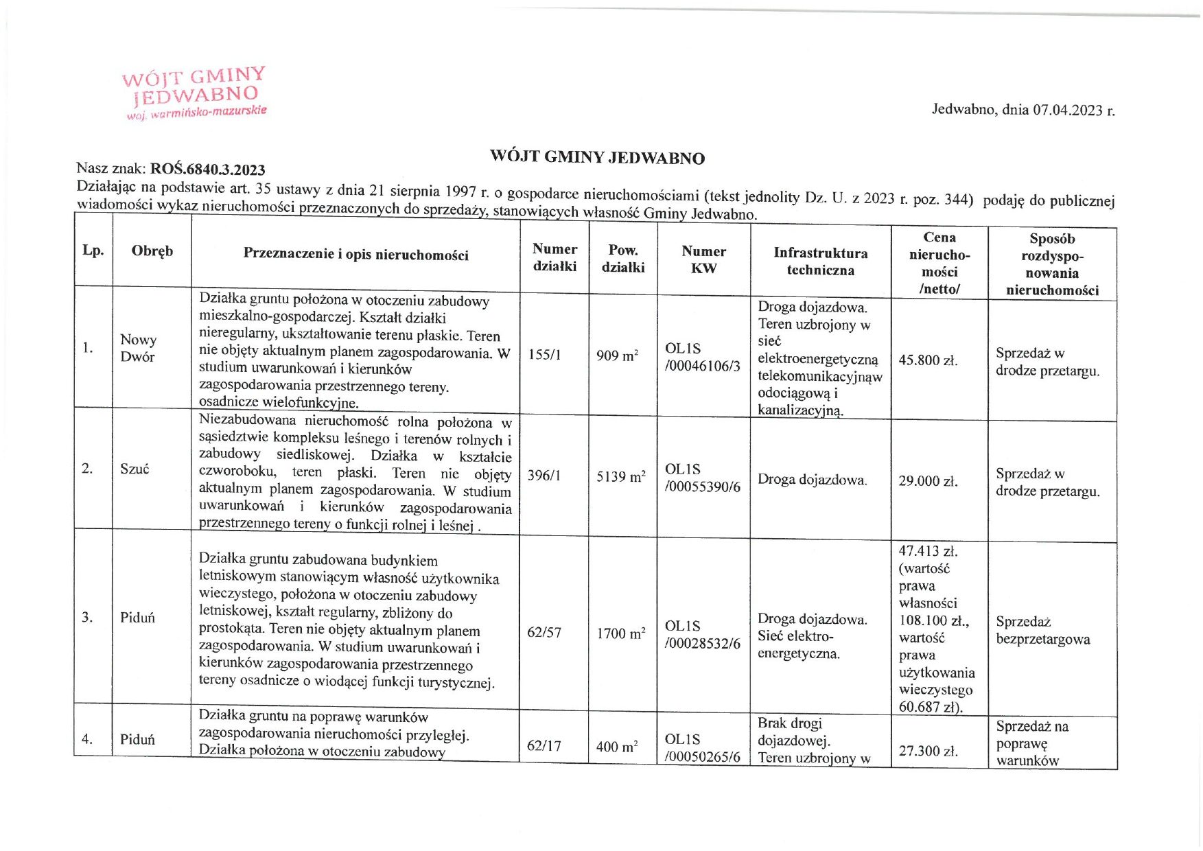 Wykaz nieruchomości przeznaczonych do sprzedaży, stanowiącej własność Gminy Jedwabno