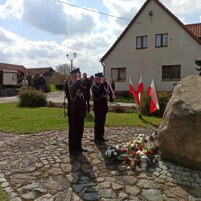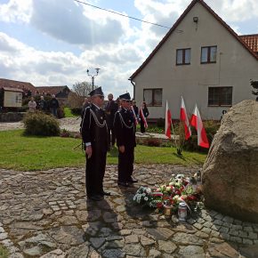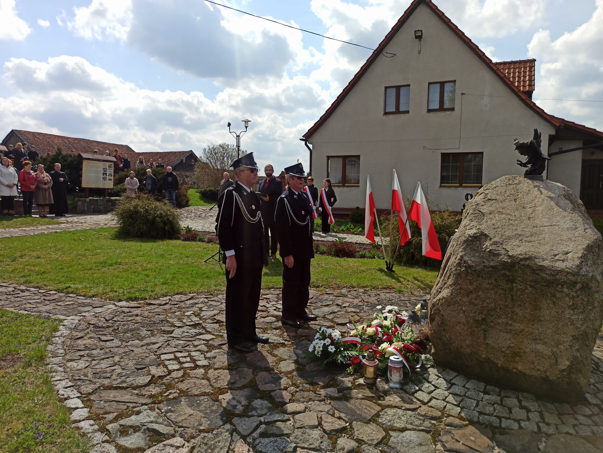 - Delegacja Ochotniczej Straży Pożarnej w Jedwabnie składająca kwiaty i znicze pod pomnikiem „Katyn – Smoleńsk”