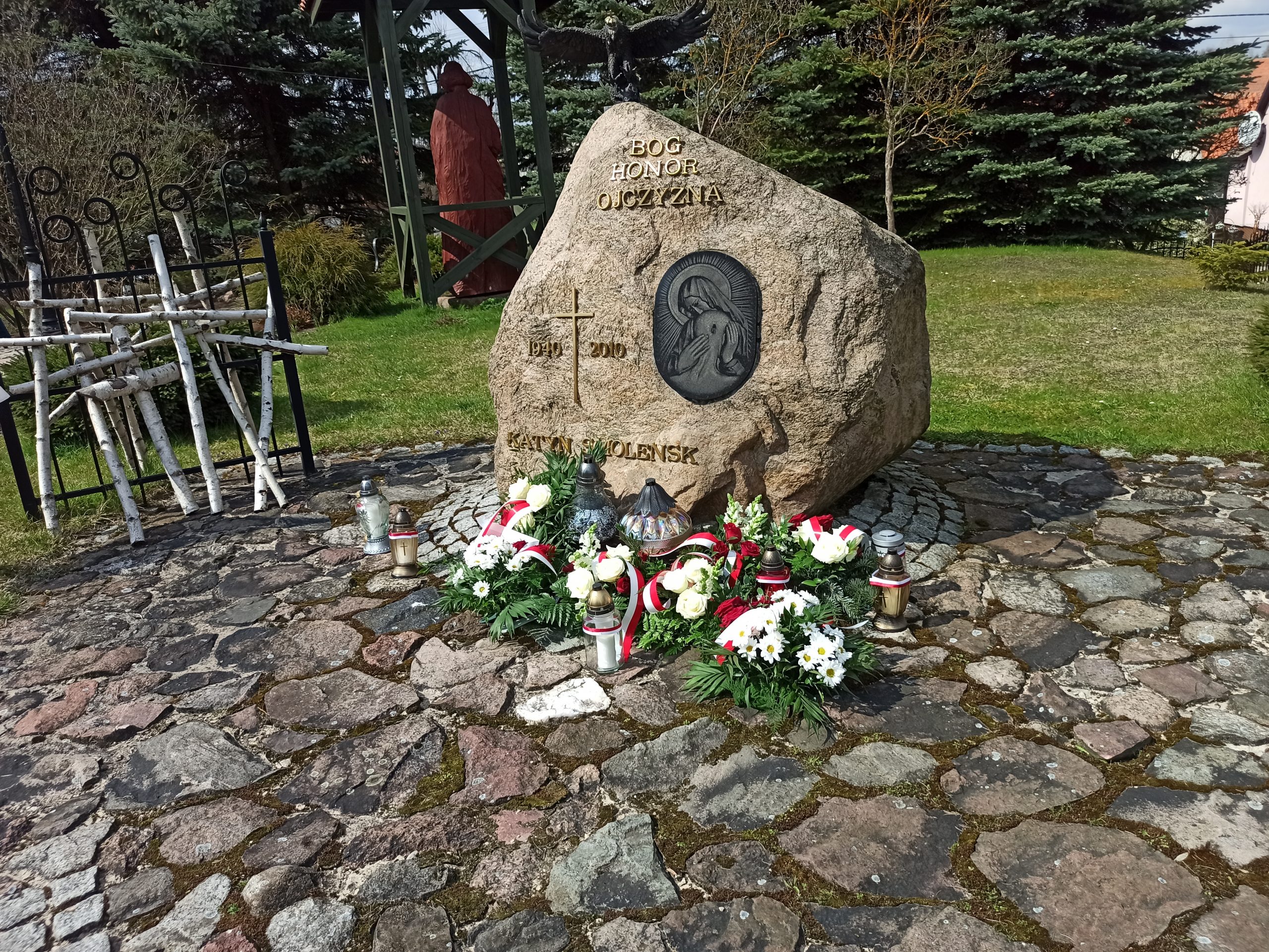 - Delegacja Zespołu Szkół w Jedwabnie składająca kwiaty i znicze pod pomnikiem „Katyń – Smoleńsk”